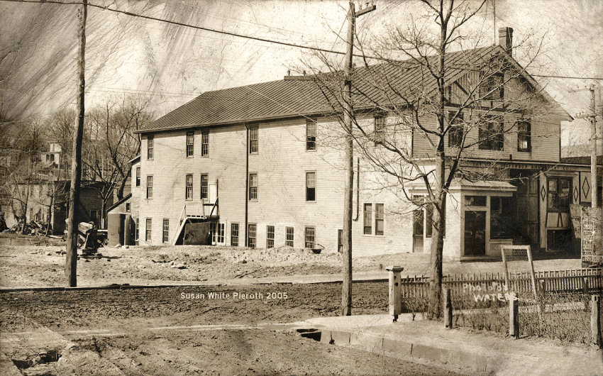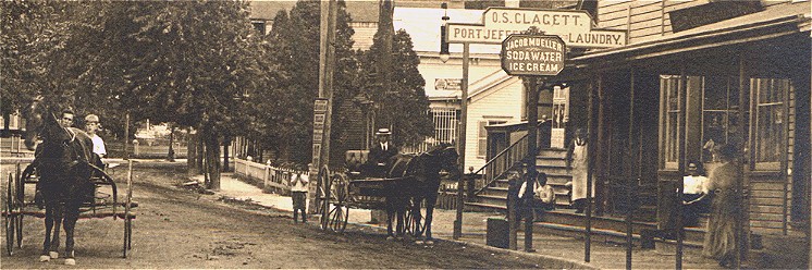 This real photo postcard shows part of Main Street, looking south, before it was paved. This was taken just south of the Presbyterian/Masonic building (see next card). The stores on the right are labeled "O.S. Clagett Port Jefferson Laundry" and "Jacob Mueller Soda Water Ice Cream." For an enlargement of two buggies and the stores, click here. |