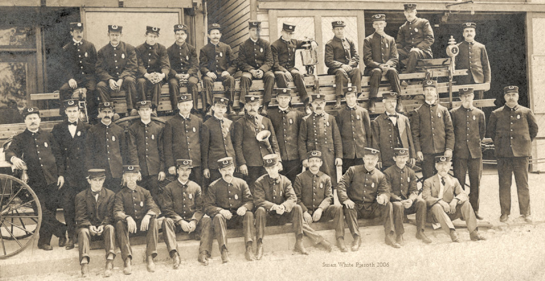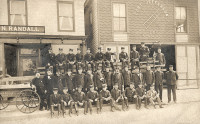 Port Jefferson Fire Department, mailed in 1907. The wagon says "Rescue Hose Company". On the back, in different handwriting from the sender's, is written, "PJFD Granpa Westphal - Front row 2nd left." For an enlargement of just the men, click here. |