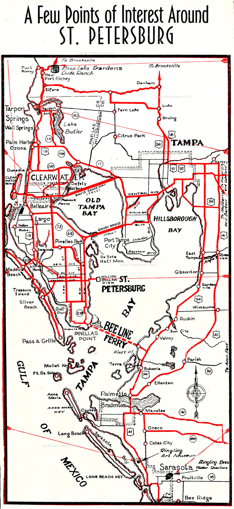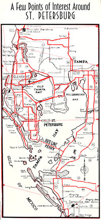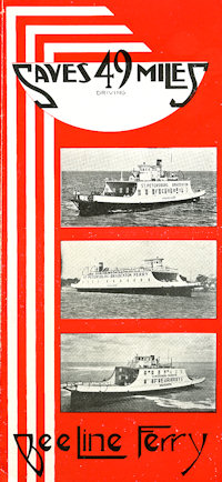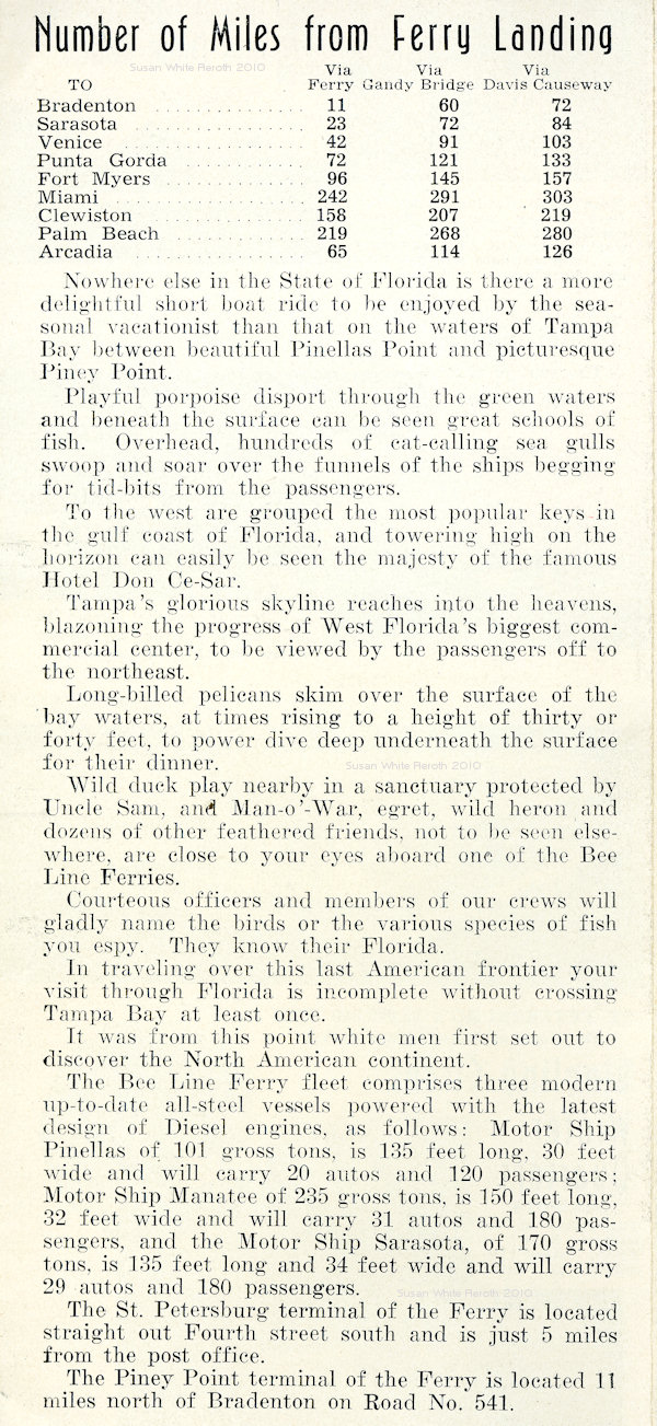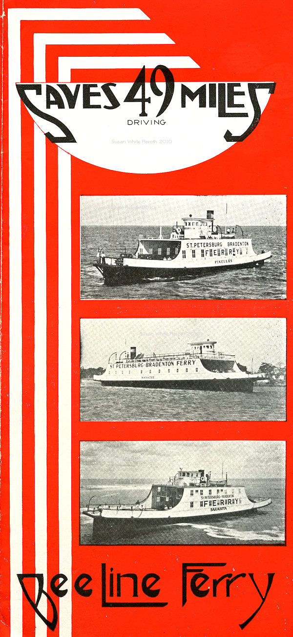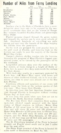 | Saves 49 Miles Driving on the Bee Line Ferry. Shown are the ferries Pinellas (20 autos), Manatee (31 autos), and Sarasota (29 autos). | The chart shows the distance between locations using the ferry, Gandy Bridge and the Davis Causeway. The text enthusiatically explains the wonderful things to see from the ferry. | This map shows both the road and ferry routes, as well as points of interest. |
