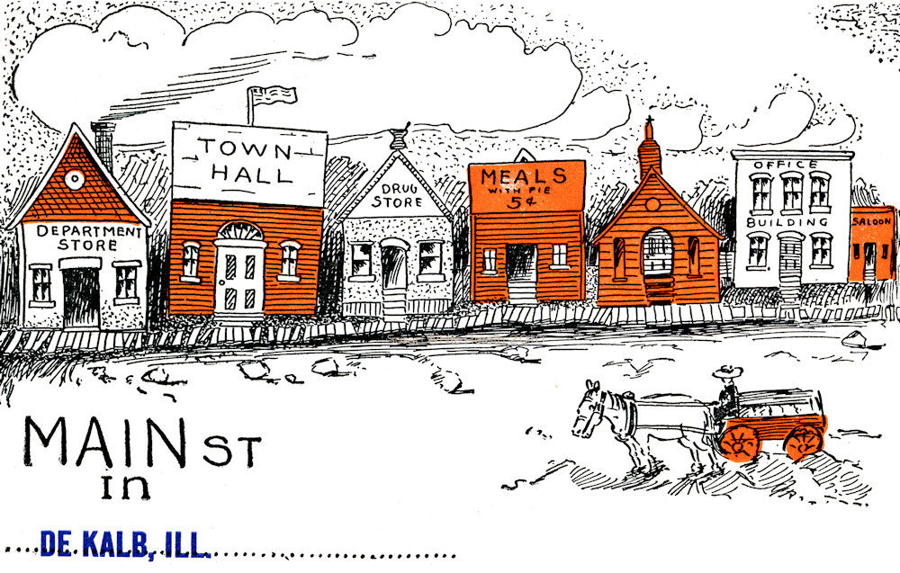 This postcard is a picture of pictures labeled "Brooks Photo." It was printed between the World Wars. For a black and white enlargement of the left column ("Scene on E. Lincoln Highway, Soldier's & Sailors Memorial in center; North Ill. State Teachers College; Joseph Glidden Hospital), click here, the middle (post office; train station), click here, the right (E. Lincoln Highway, E. of Third St.; Scene on Campus, No. Ill. State Teacher's College; De Kalb Township High School), click here. |