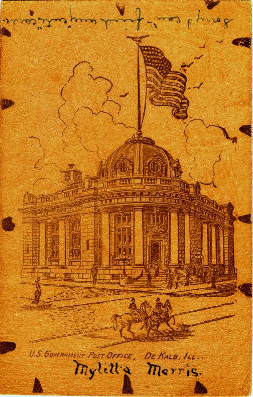 Office, DeKalb, Ill." This postcard is made of thick, soft leather. Mailed