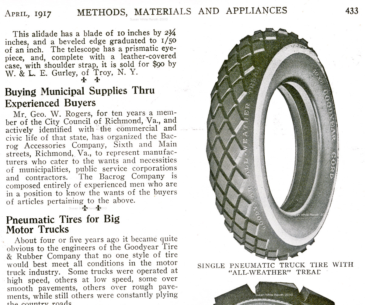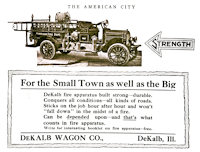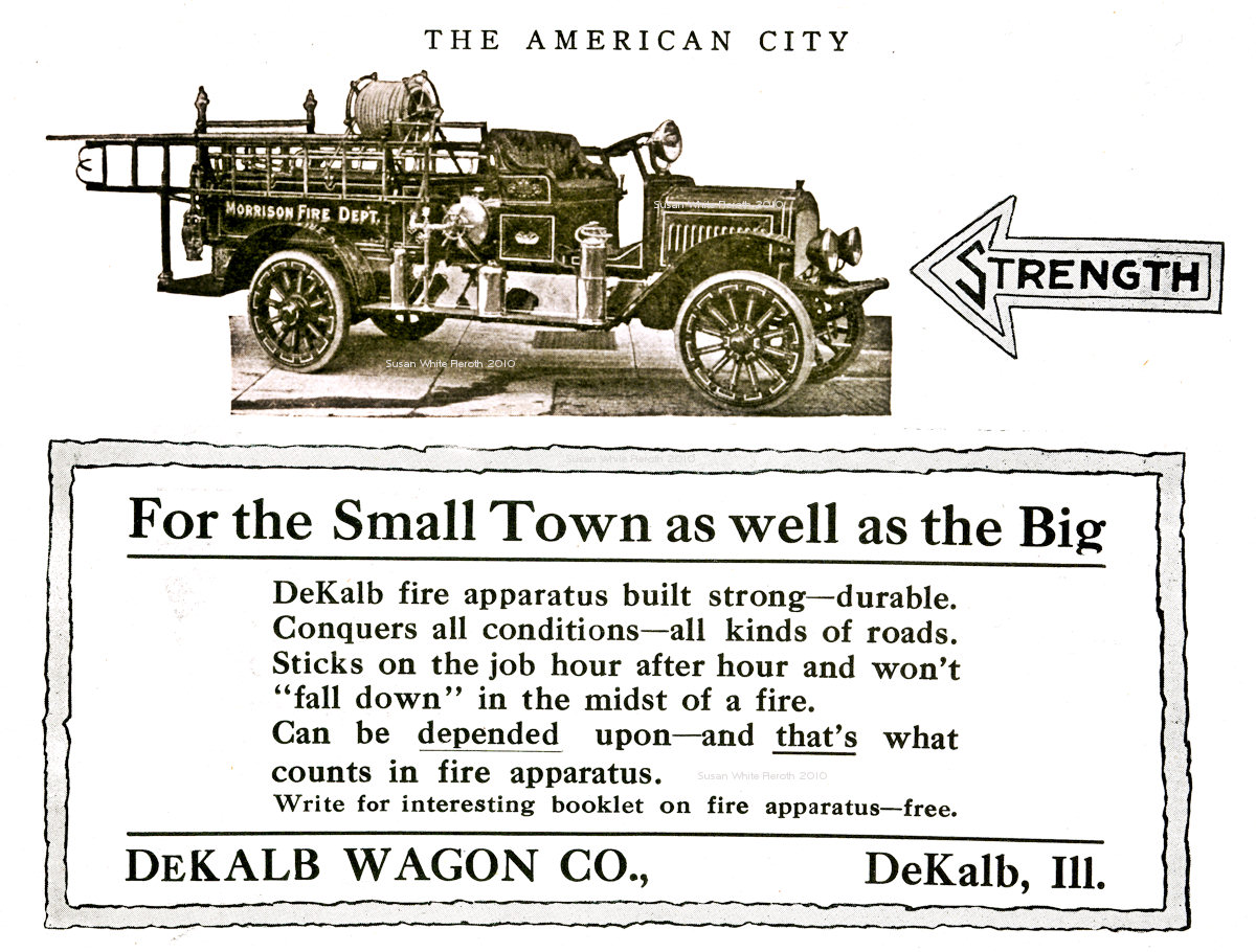 ![]() | Left: An ad from the April 1917 edition of The American City: Methods, Materials and Appliances for the DeKalb Wagon Co. Click here to see the tire ads on the back of this section of the page.Right: a larger view of the Morrison Fire Dept. engine made by DeKalb Wagon Co. |