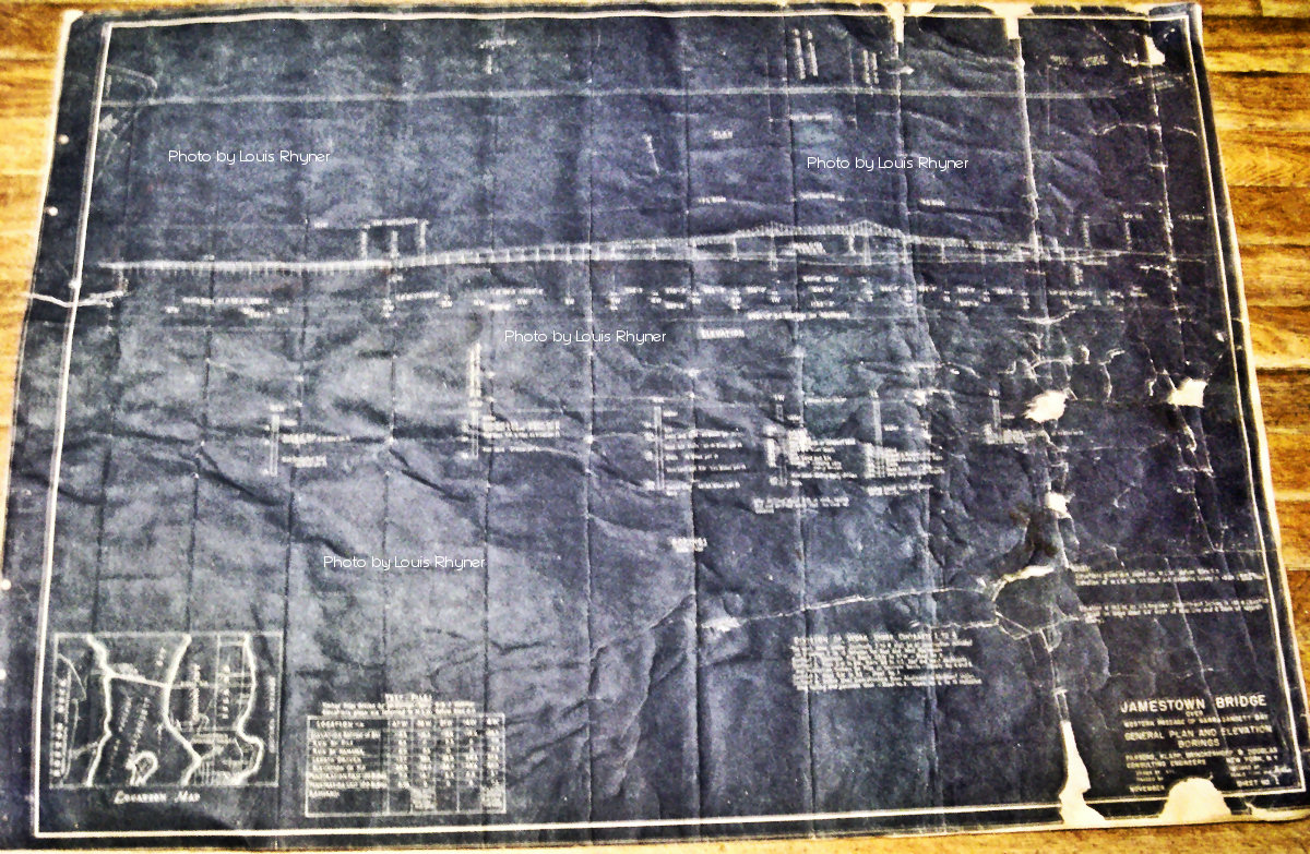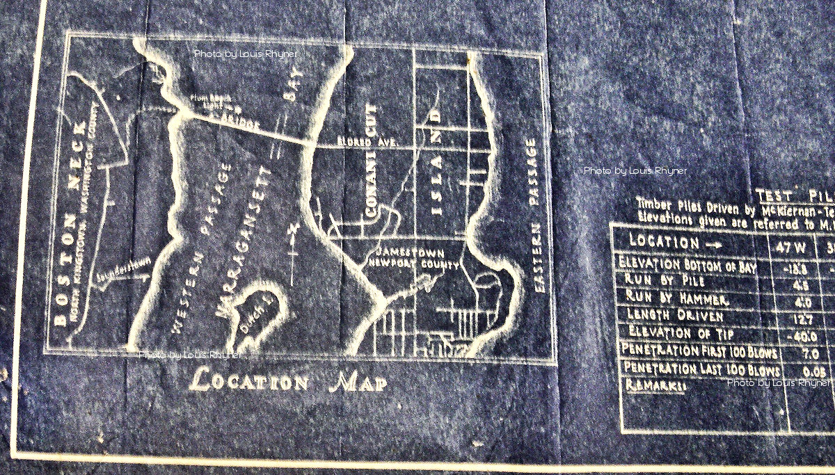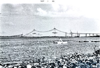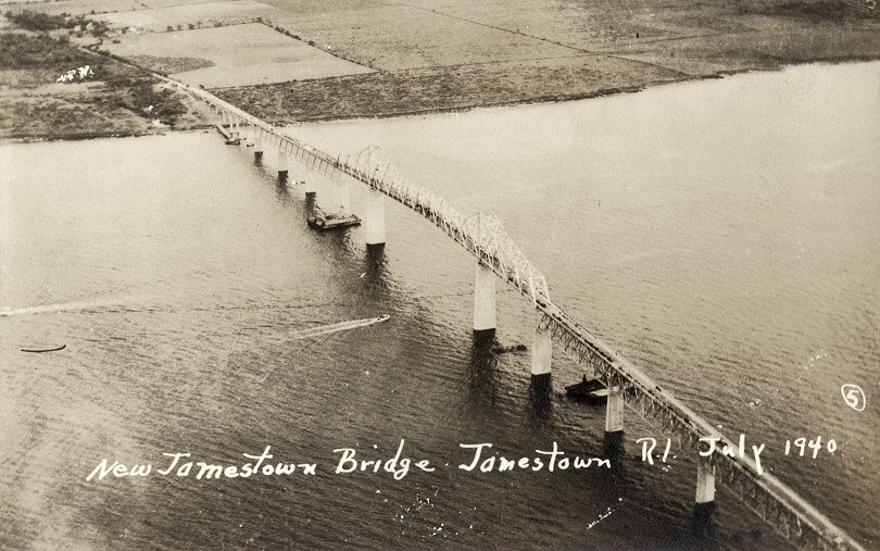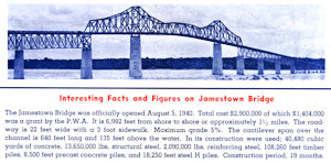 Interesting Facts and Figures on Jamestown Bridge - from a brochure promoting the bridge and ferry to get to Cape Cod. The cost was $2,900,000. It was approximately 1 1/2 miles long and took about 19 months to build. There are two videos on YouTube showing the final implosion of the bridge: One (from a TV newscast), Two (home video). |