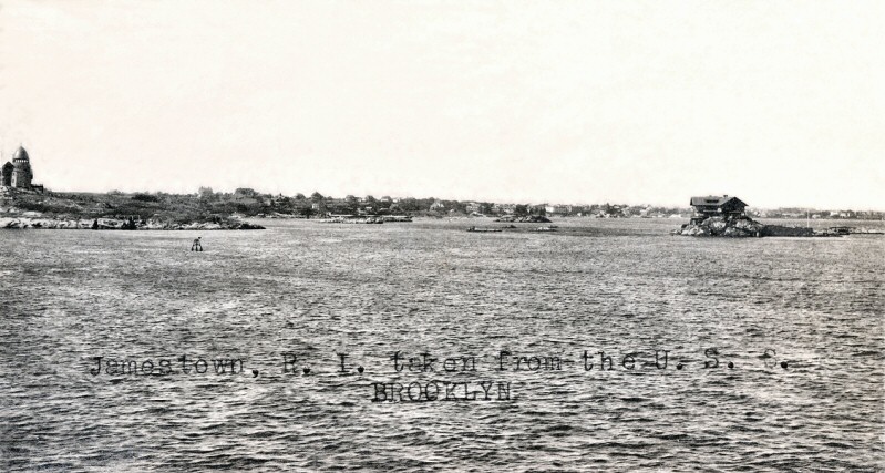 This card is labeled "Jamestown, R. I. taken from the U. S. S. Brooklyn." On the right is the "House on the Rocks" and just to the left behind is is a ferry near the dock. On the left is Horsehead. The second Thorndike and the Bay View are between. This was probably taken in the mid-1930's. For an enlargement of the shore, click here. |