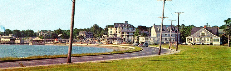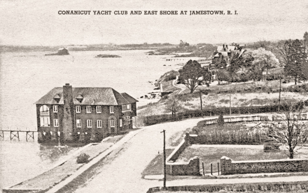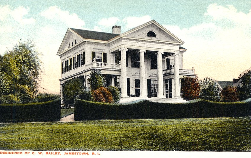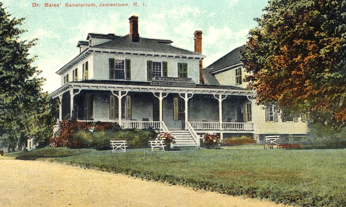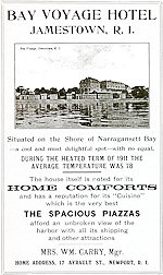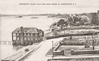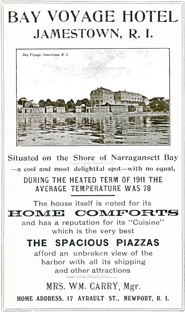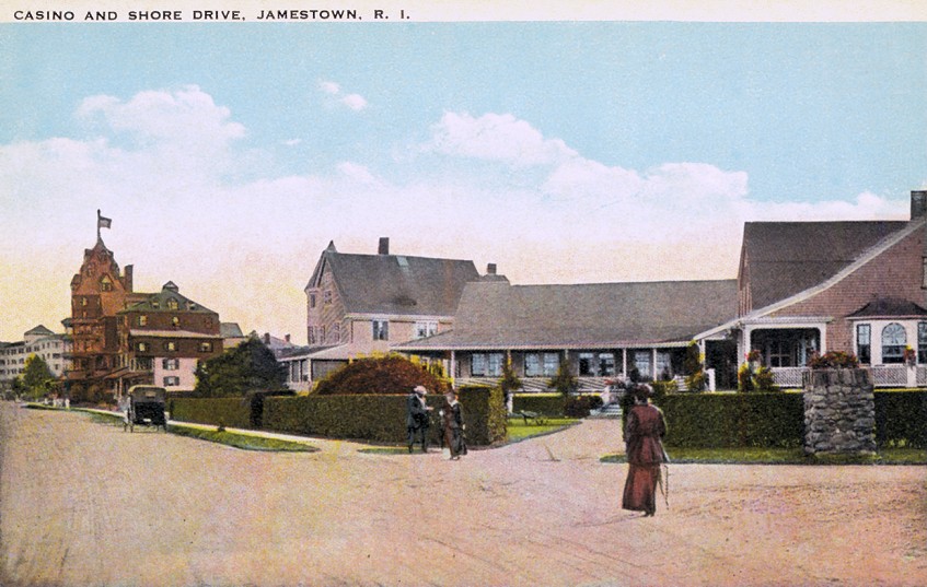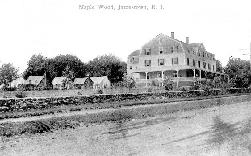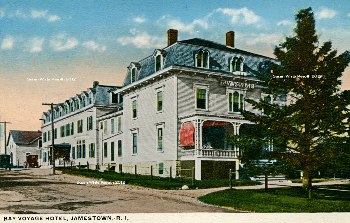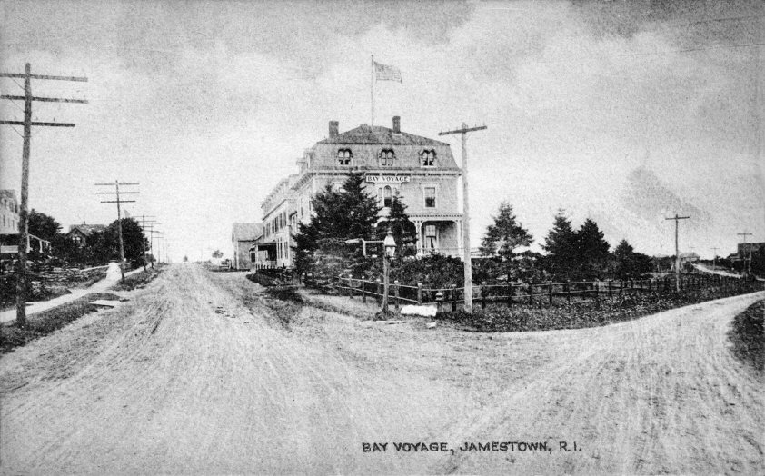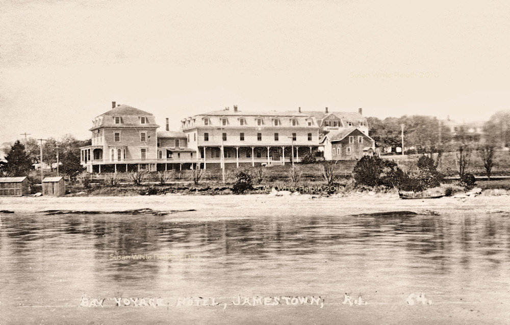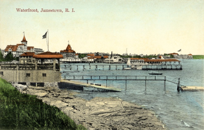 "Bathing Beach, Jamestown" mailed in 1913. At the left is the Casino, in the middle Maplewood and on the right is the Bay Voyage Hotel. |
