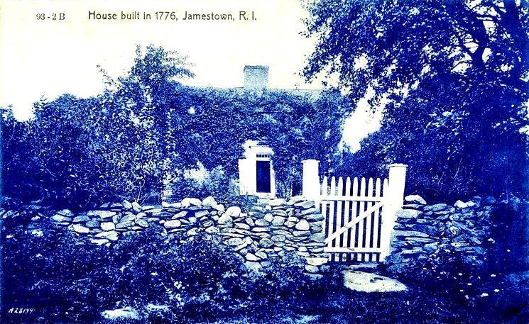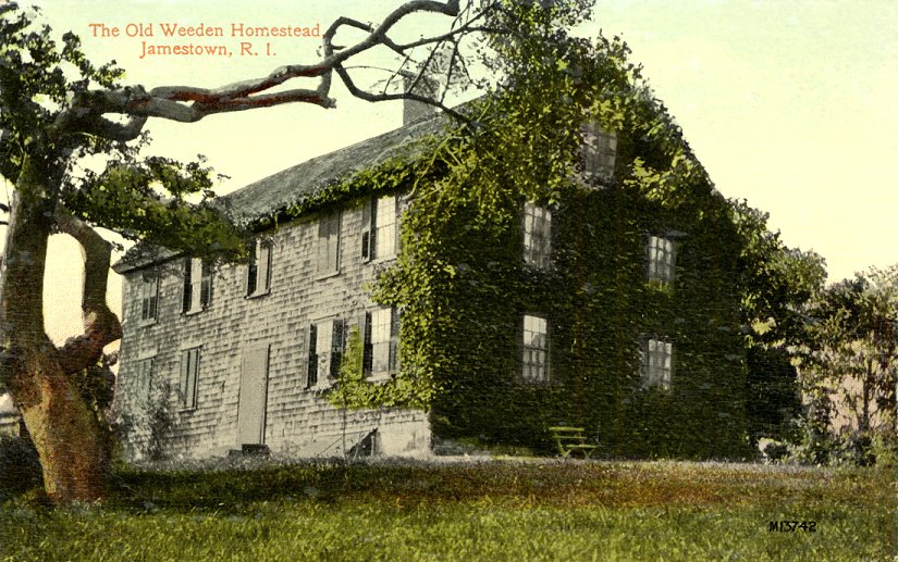"The Old Weeden Homestead, Jamestown, R. I." Built by John Weeden on the south side of Weeden Lane between 1680 and 1690. It was occupied by the Weeden family until 1924 and torn down in 1930. |