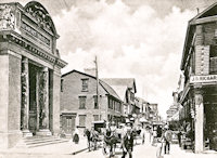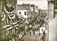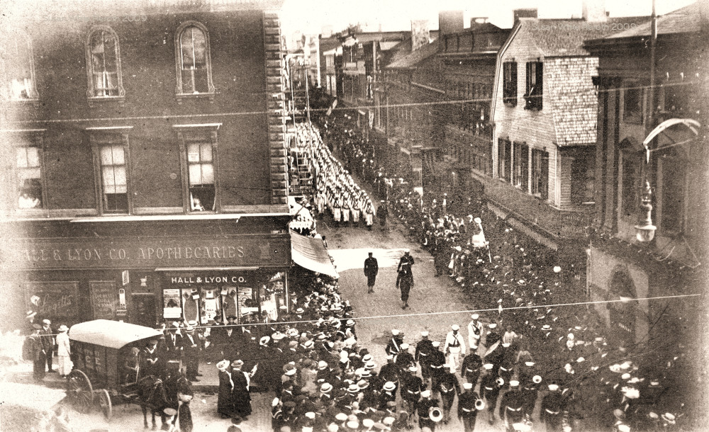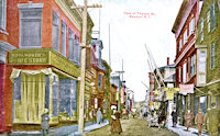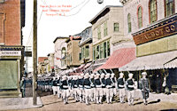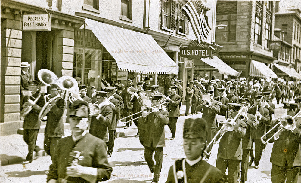 Street Fete - from a view book.Right: Band on Thames Street, June 16, 1914 (according to the note on the back). People's Free Library and U.S. Hotel are on the left. |