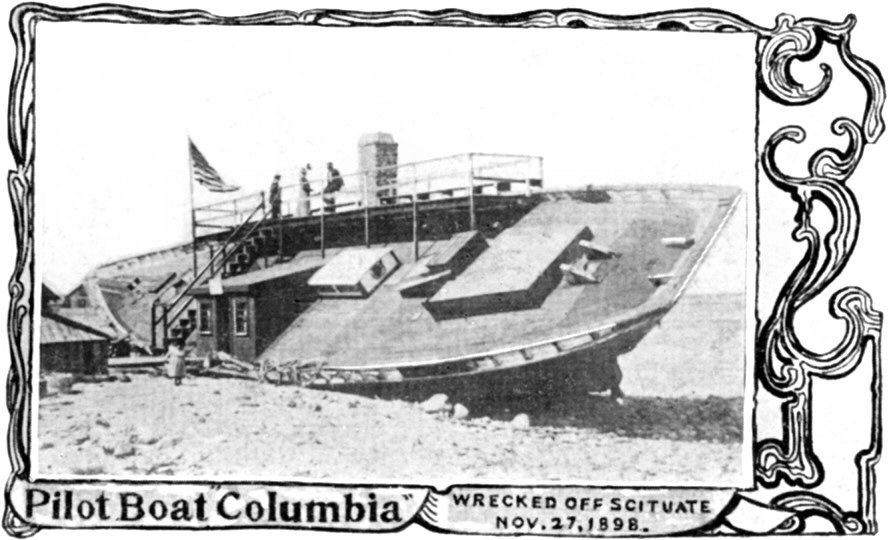 "Pilot Boat Columbia wrecked off Scituate [Mass.] Nov. 27, 1898." Mailed in 1905. The schooner was wrecked in the Portland Gale with a loss of five crew members. This site has excellent information about the gale, including this wreck. |
