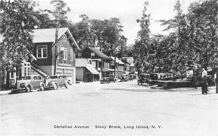 "Post Office and Fire Department, Stony Brook, Long Island, N. Y." When the Community Center Shopping Center was built with a post office and fire house the post office was move and became a house. The Fire Department was converted into a museum. It is now the Garden Club Exchange. Part of a gas pump can be seen at the right. For a newer card of this view, click here. |