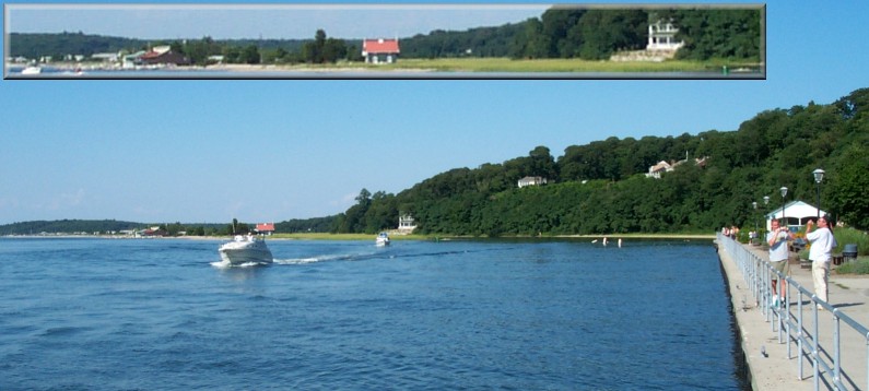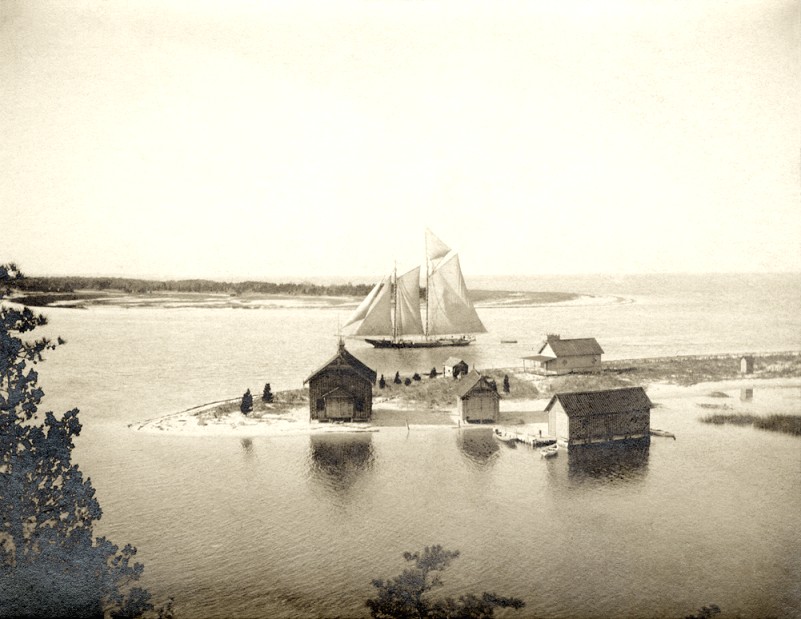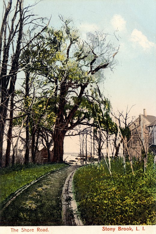 "Shipman's Beach from the Bluff. Stony Brook, Long Island, N.Y." This is the end of West Meadow. Many of the cottages are still there. No date, but there are utility poles. |