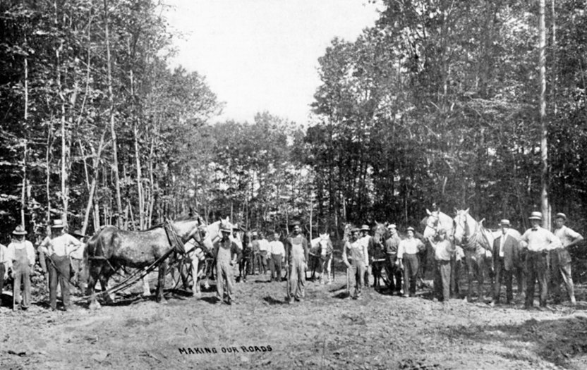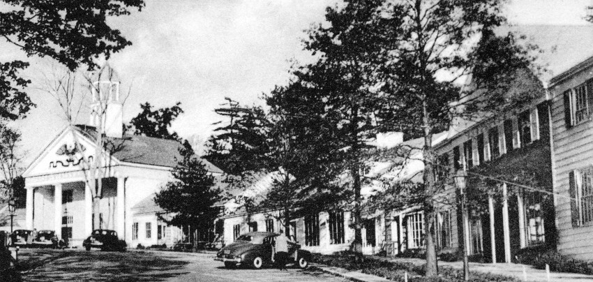 The Community Center Shopping Crescent not long after it was built by Ward Melville in the early 1940s. The grand opening was December 7, 1941. The tall center building is the post office. The eagle flaps its wings on the hour. Only minor changes have taken place - such as additional parking. For an enlargement of the buildings click here. |