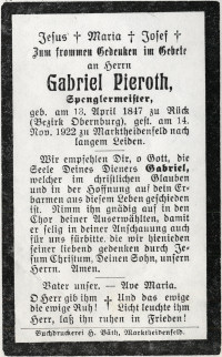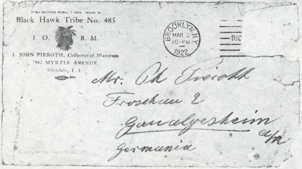 Notes for JOSEF JOHANN PIEROTH: Letterhead (below) said 'Tin, Copper and Sheet Metal Worker; Special Cooking Apparatus by Electricity, Gas and Steam; also Heaters and Warming Closets.' Lived at 34 Floyd Street, Brooklyn when his only son was born. Lived at 2962 Myrtle Avenue, Glendale, New York in 1922. Member of Black Hawk Tribe No. 485; I.O.R.M [Improved Order Of Red Men]; Collector of Wampum. Went by the name J. John Pieroth.