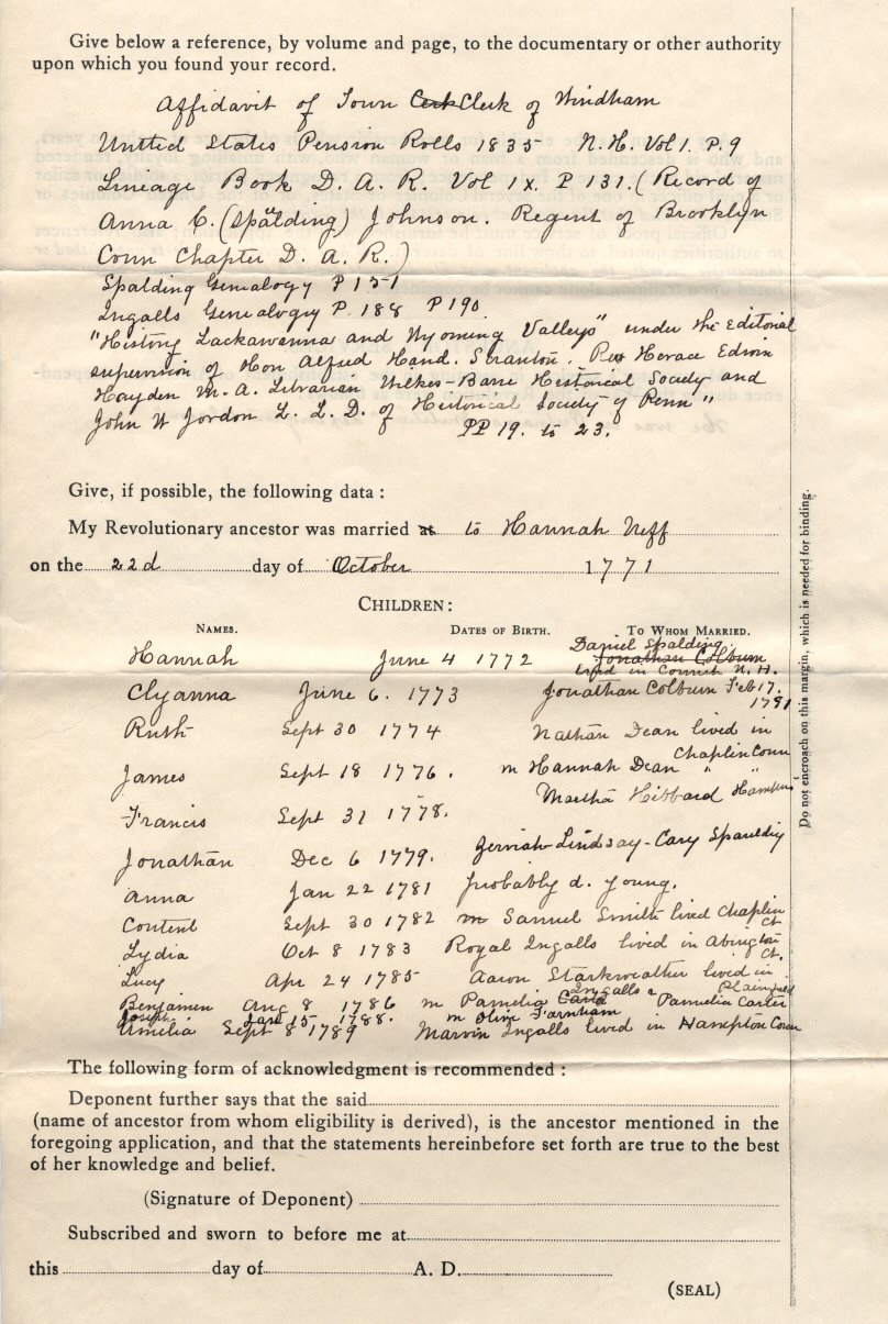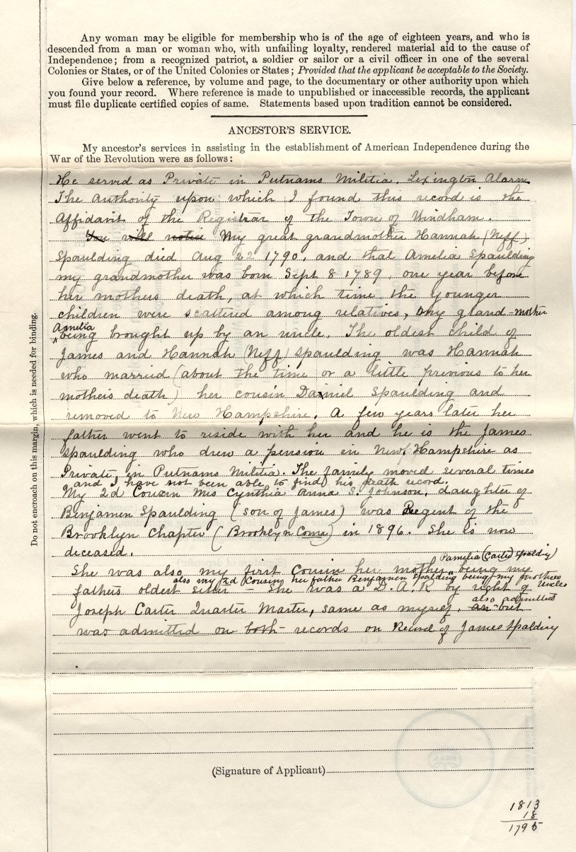 James Spaulding (also spelled Spalding in earlier records) was apparently the first supplemental application. This line is through her mother Olive Ingalls Carter to her mother Amelia Spaulding Ingalls and daughter of James Spaulding. The four scans (page 1, page 2, page 3, page 4) are from different drafts. I picked the pages that contained the most complete information.