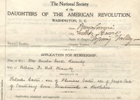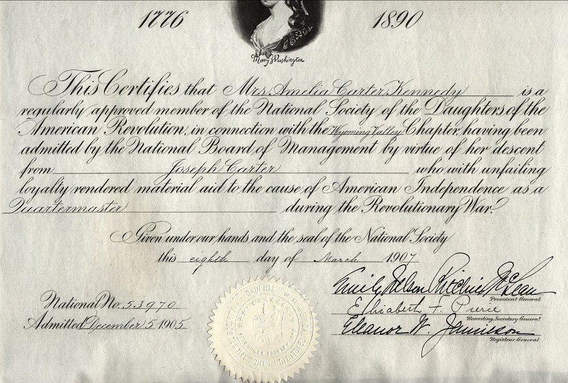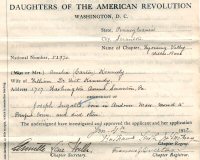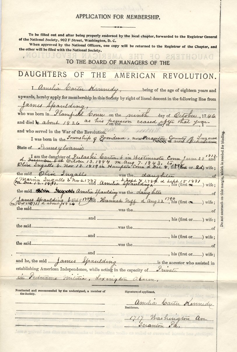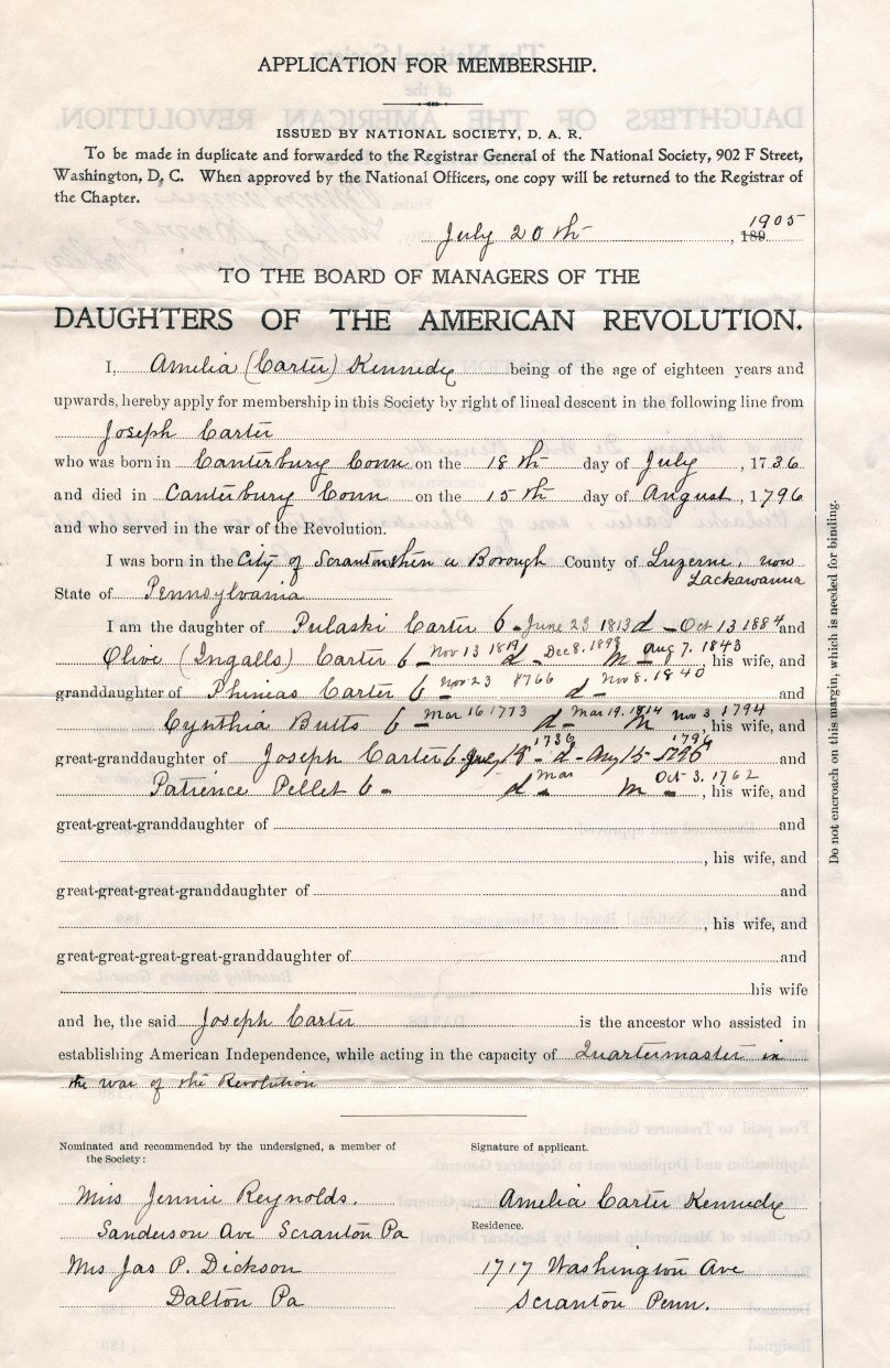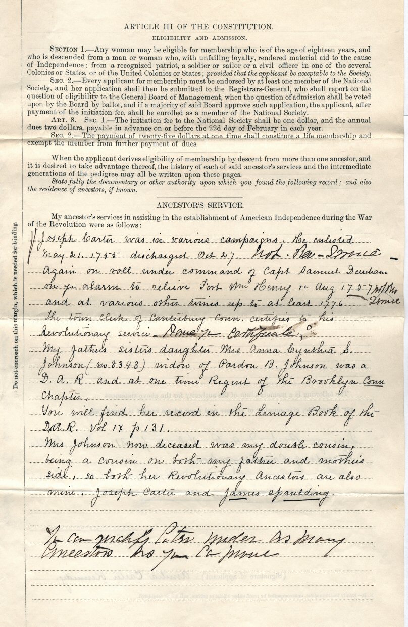 The only copy I have of the Joseph Carter application (Amelia Carter, daughter of Pulaski Carter, son of Phinehas Carter, son of Joseph Carter - see page 1) has the names Miss Jennie Reynolds and Mrs. Jas P. Dickson under the section "Nominated and recommended by the undersigned, a member of the society" on page 2. There are corrections and notations by someone other than Amelia. The most interesting part of this document is on page 3 under "Ancestor's Service". Amelia states, "My father's sister's daughter Mrs. Anna Cynthia S. Johnson (no 8343) widow of Pardon B. Johnson was a D.A.R. and at one time Regent of the Brooklyn Conn. Chapter. You will find her record in the Lineage Book of the D.A.R. Vol IX p 131. Mrs. Johnson now deceased was my double cousin, being a cousin on both my father and mother's side, so both her Revolutionary Ancestors are also mine, Joseph Carter and James Spaulding."