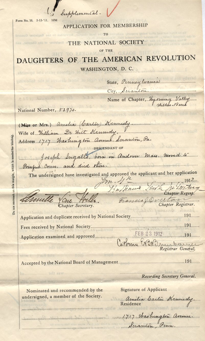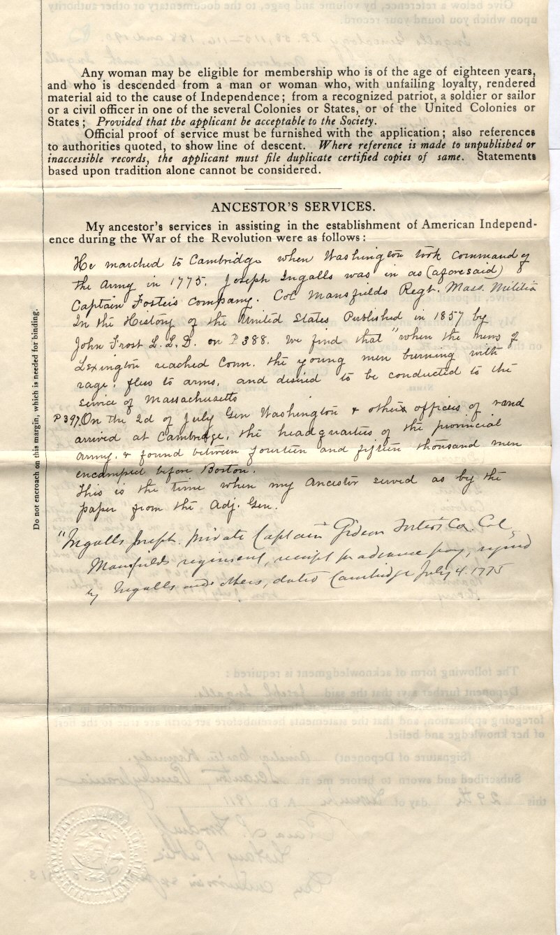 The third is for Joseph Ingalls (Amelia's mother Olive Ingalls Carter, daughter of Marvin Ingalls, son of Peter Ingalls, son of Joseph Ingalls of Andover, Massachusetts and later Pomfret Connecticut. This is the only application that has a stamp of approval, dated February 23, 1912. This is a complete and notarized copy - page 1, page 2, page 3, and page 4 - from 1912.