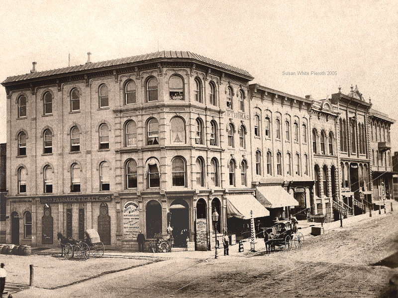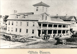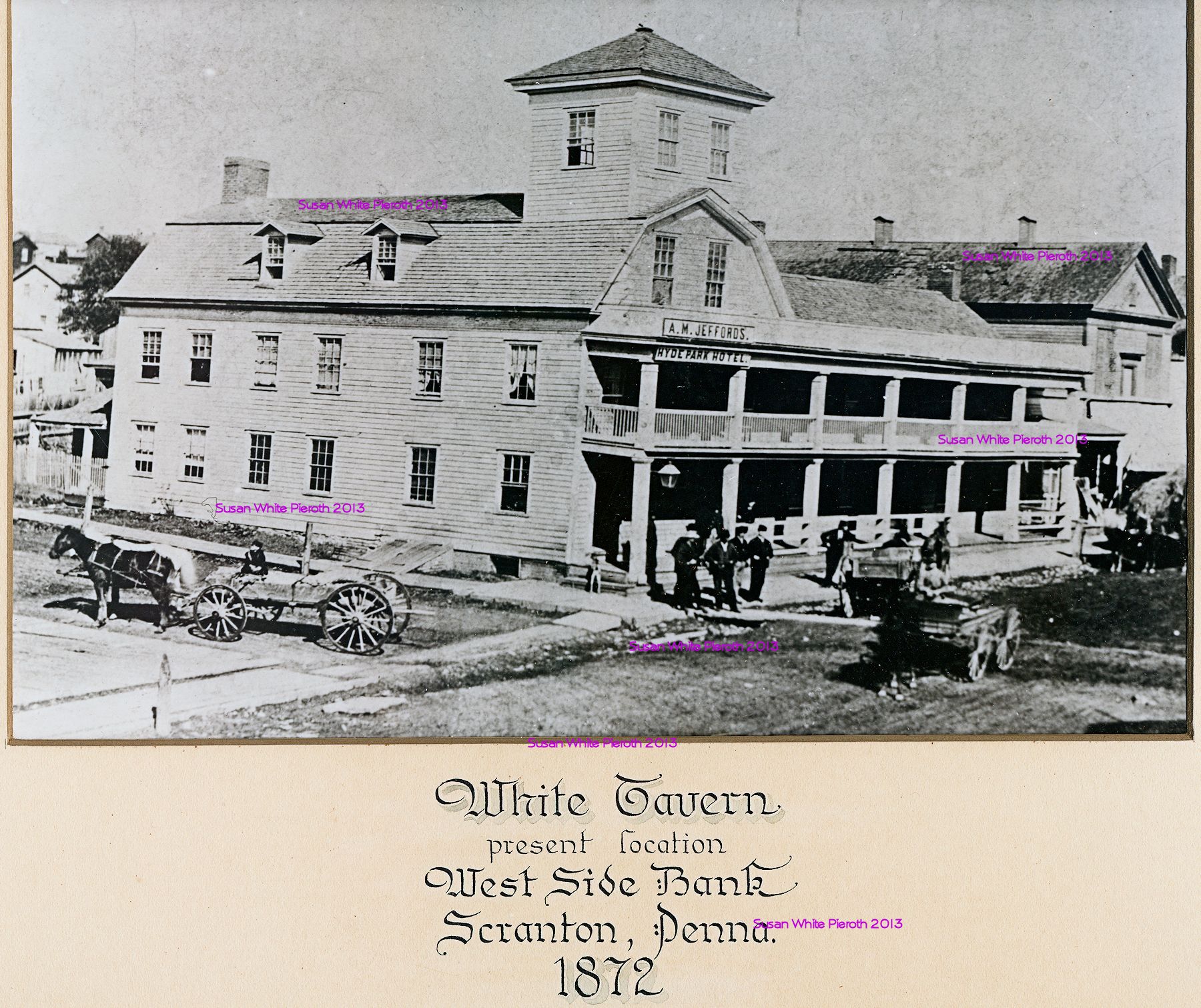 | Above: a block of North Main Avenue in the Hyde Park section, labeled 1889. Photograph by Henry Frey of Hyde Park. The back states, "property of May Schmidt, rear 308 Hickory, Scranton, Pa.". On the side is a passage ticket agent. Morgan & Co. Drugs is on the corner. Next is J. G. Thomas, Gents Furnishings, Goods, Merchant, Tailor. The building to the left of the tallest is the Hyde Park Bank, later the West Side Bank (below). For a larger click here. In 1913 the bank moved into the drug store building. | Labeled "White Tavern," however, the building says A. M. Jeffords, Hyde Park Hotel. It is also alternately referred to as the Heerman Tavern. It was on the corner of Jackson Street and North Main Avenue in the Hyde Park Section. It was destroyed by fire in 1871. As the full mat (click image to see) indicates, this was later the site of the West Side Bank (after the location in the block at the left). |