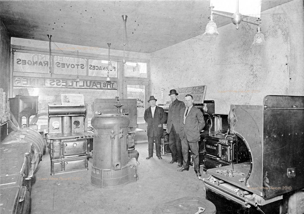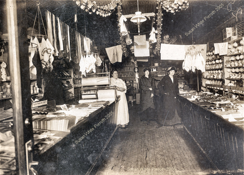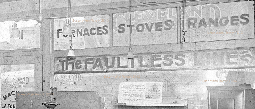 Machler - La Fontaine & Co.; 711 W. Lackawanna Ave., May 1917. Dealers in Faultless Ranges, Furnaces and Boilers, as well as Cleveland Tires and Tubes. The 1922 directory lists Russell H. Machler, Wm. H. La Fontaine, Harold Machler. | ![]() The window reversed. |