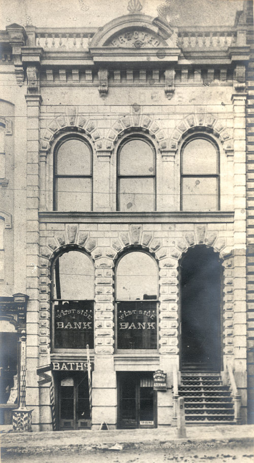 This is a picture of the West Side Bank, originally the Hyde Park Bank in the picture above, left. The name, Hyde Park Bank, was part of the building face, but it was either removed and a shallow West Side Bank put in its place, or the picture was altered. See the larger version (250kb). At the top, "Erected in 1873". | ![]() From a Scranton Tribune book, "The City of Scranton and Vicinity and Their Resources" about 1894. Provided by Rudy Kunz. |