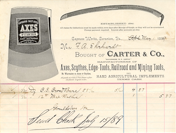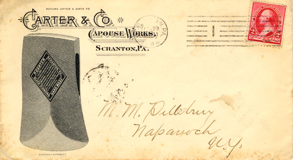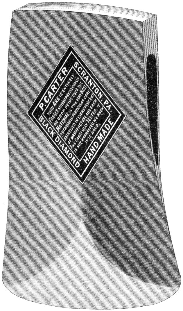 The manufacture of axes was begun in Scranton in the year 1841 by Pulaski Carter and the Capouse Works, as the plant was then named and is still known, was one of the first industrial establishments located in Scranton. The present firm of Carter & Co. was organized in 1884. The products of the works are axes, wood-choppers’ tools and mining tools, and the firm are also wholesale dealers in hand agricultural implements. The firms’ axes are their great specialty. Their motto has ever been and is now, to make nothing but the very best axe, which has always been know as a great favorite with lumbermen. For the past twenty years they have sold these tools against their competitors, who warranted their goods, but the widespread reputation of the Carter Superior Cast Steel Axes required no warranty, as their relative merits and good qualities were both well and widely known.