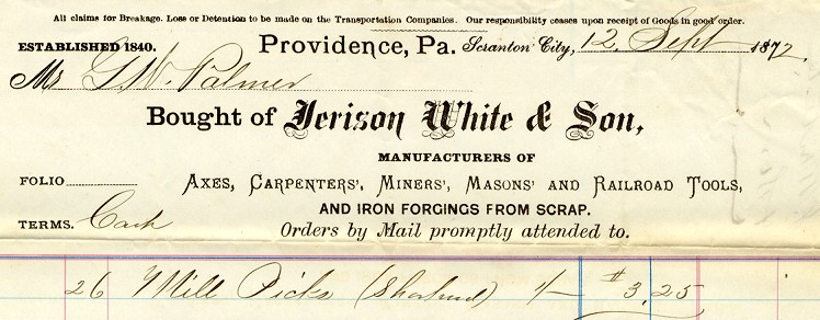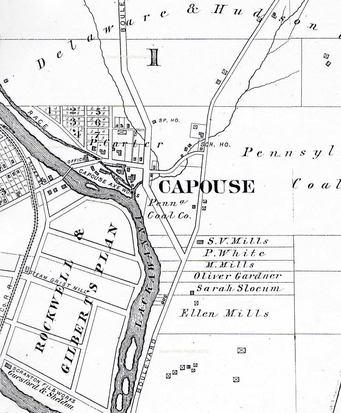 The Capouse Works of Pulaski Carter were established in 1840, by Jerison White. This was the first edge tool factory started at Capouse. Soon after Mr. White sold out to Mr. Carter and removed to Providence where he erected a second factory, which, together with his dwelling, was swept away by a flood. Mr. White then built a small, rude shop, placing a bellows therein, and with the assistance of a boy began business on a small scale. In 1847 he built a larger factory and occupied it until 1861, when he sold out to his nephew, Crandall White, who conducted it for some time during the war. After the war was over Edward H. White and his father, J. White, were taken into partnership, and the business was resumed. In 1874 they removed to Green Ridge Avenue, and carried on the business there until 1878, when they abandoned it altogether. This establishment enjoyed the highest reputation, their specialty, axes, being made of the best Sheffield steel, tempered by a process that was original with the original proprietor.