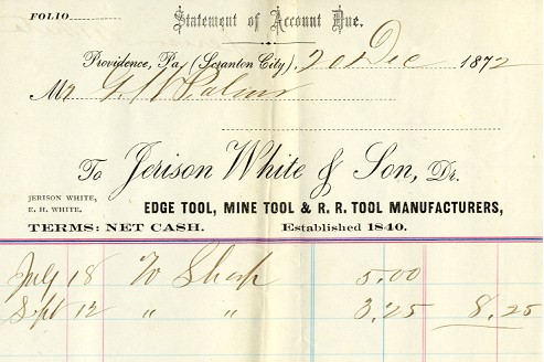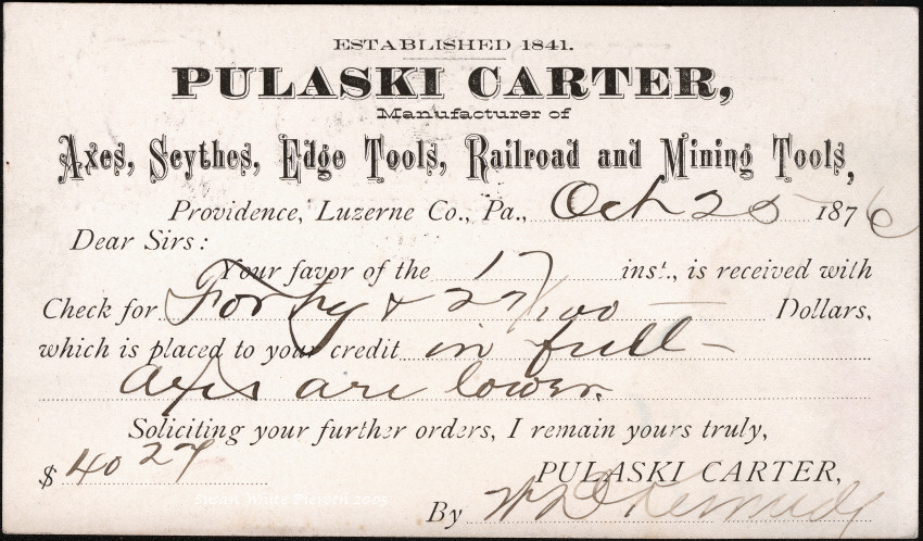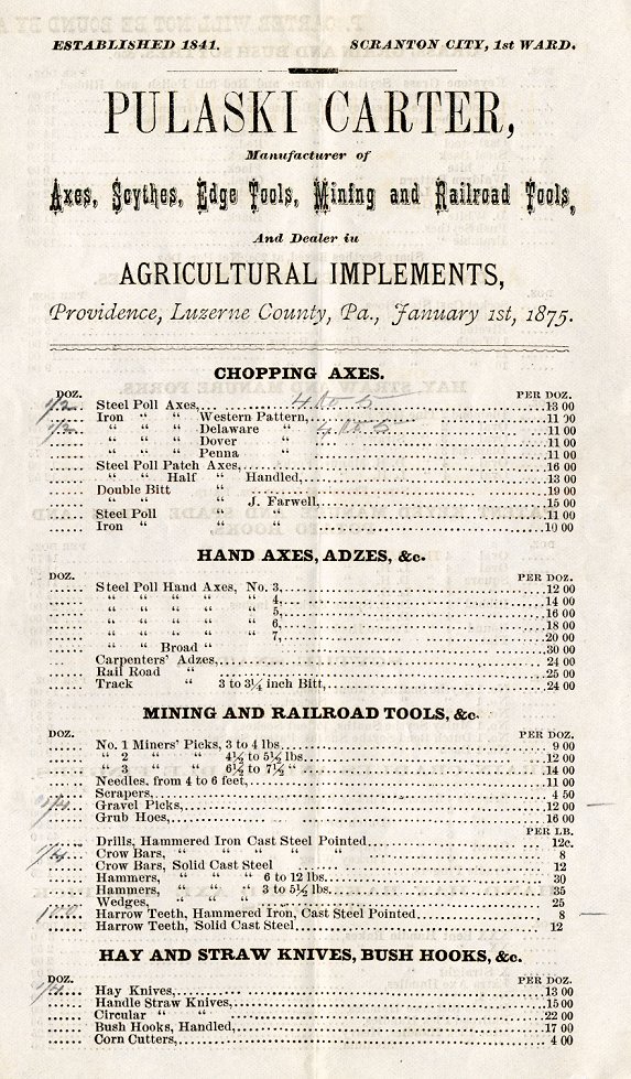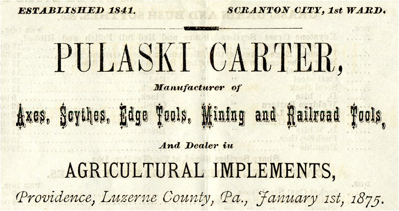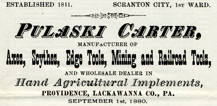 To the Carter and Kennedy Main PageTo the Article: Pulaski Carter; Manufacturer of Axes and Edge Tools, Providence, Pennsylvania