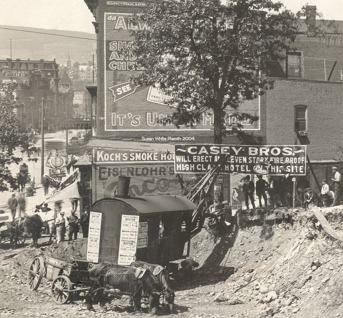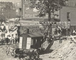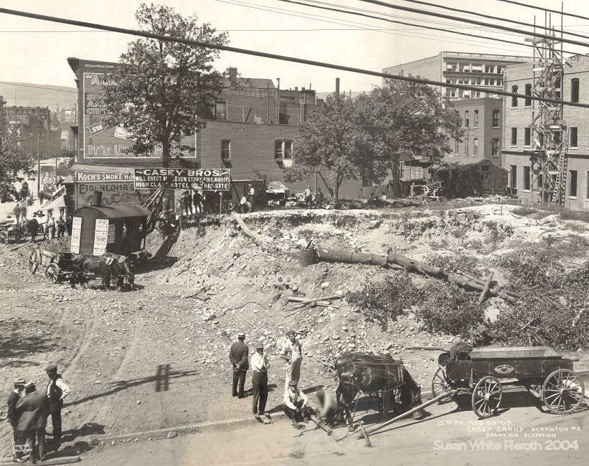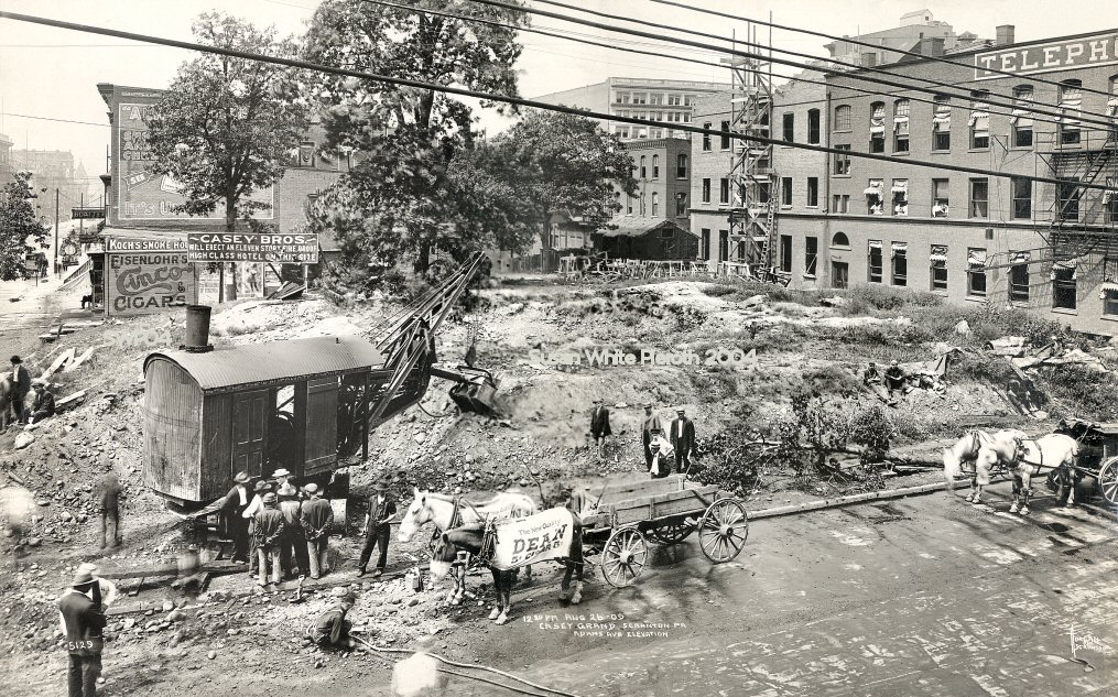 Long before the hour when Lackawanna avenue assumes its busy hurly-burly in the neighborhood of the Lackawanna railroad station, two men scampered up the embankment at the corner of Lackawanna and Adams avenues. Like boys out for a play(?) their ragged faces bore happy smiles. Suddenly one of them took a pick in his hands and with a hefty swing sunk the shiny steel into the earth, clean up to the handle. Then without waste of words and a grin the younger of the two sank a shovel into the loosened earth and turned it over. The other man tried the shovel too and in an instant it was all over, ground was broken for the Casey Grand, and the men were P.J. and A.J. Casey, who are building it.
