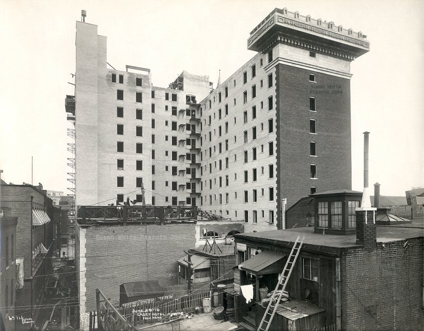 To do the woodwork in the Hotel Casey was a job of much magnitude. It is an eleven-story building and there are 1,100 doors and 600 windows alone. There are thousands of feet of elaborate mouldings, plate shelves, paneling, and a bulk of fixtures of all kinds....