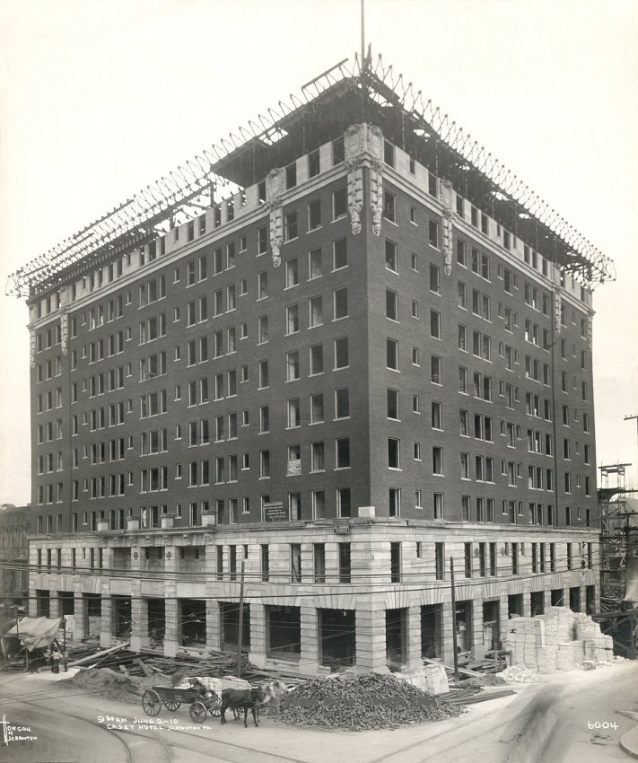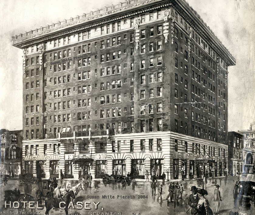 Built for permanency, with an idea to the beautiful, and thought for the convenience of the public, the Hotel Casey stands today completed, an imposing monument to the courage of two men, Andrew J. and Patrick J. Casey, who, with their own resources reared at the corner of Lackawanna and Adams avenue, one of the most magnificent hotels in the country.