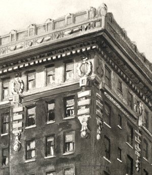 The lobby or rotunda is the striking feature that greets the eye on entry to the hotel. It is a big square hall in the Italian Renaissance. The floor is tiled and conspicuous in the tiling, is the crest of the hotel, shaped like a shield with a broad bar running diagonally across and the latin phrase "Per Varios Casus" (through many vicissitudes) inscribed thereon. This crest is on all the linen, on much of the furniture, on all the stationary, the silver, and in the schemes of decoration in various parts of the hotel. The sidewalls of the lobby are wainscoted in Italian marble to a height of nine feet. Above this is eight feet of oxidized green and gold paneling, surmounted by a cornice and embellishments of old ivory.