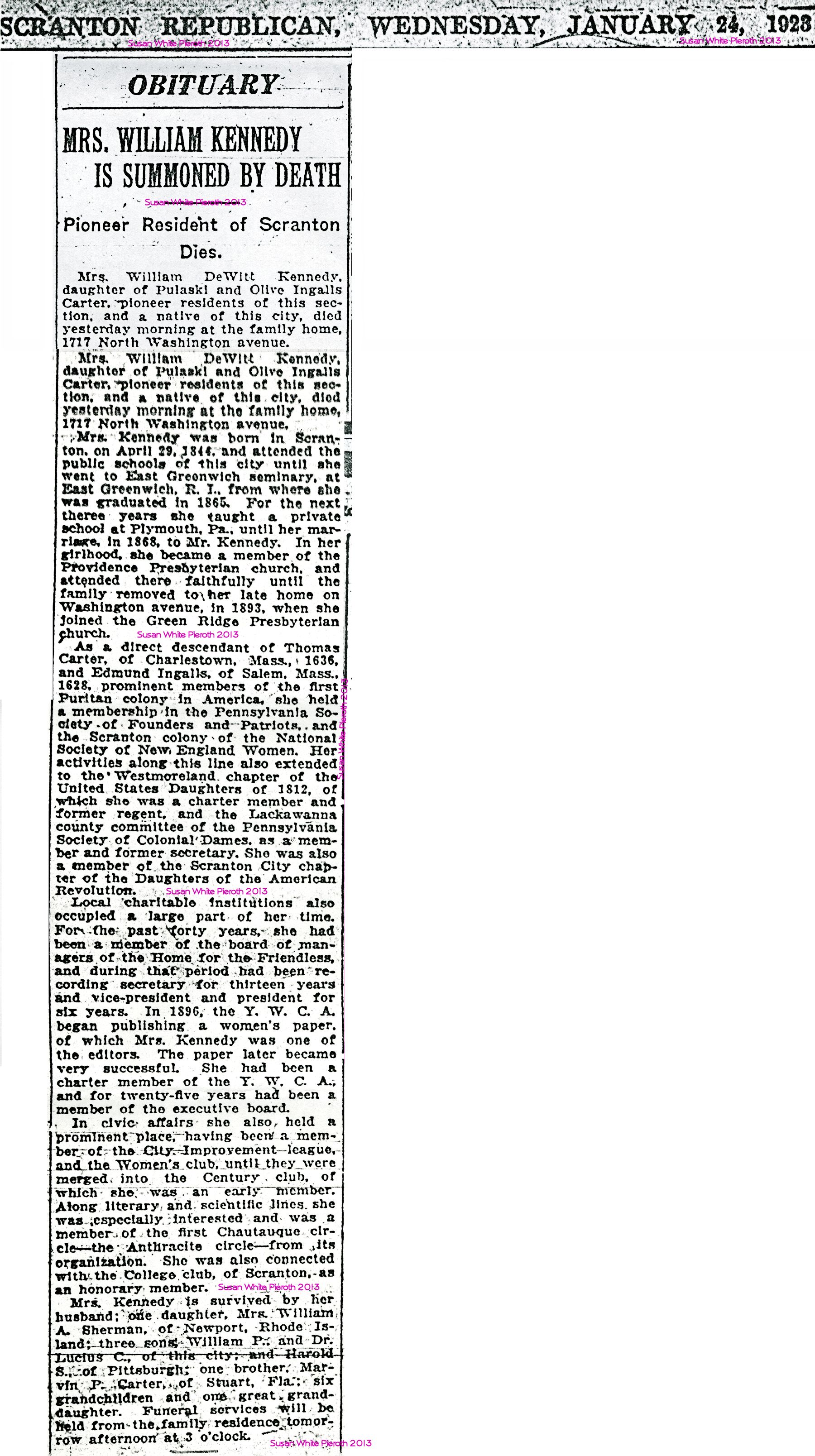 Mrs. Kennedy was born in Scranton, April 29, 1844. She was the daughter of Pulaski and Olive Ingalls Carter. After attending the public schools of this city she completed her education in the seminary at East Greenwich, R. I., graduating in 1865. After graduation she taught for three years in Plymouth, Pa. Her marriage took place in 1868. She was a faithful member of the Green Ridge Presbyterian church.