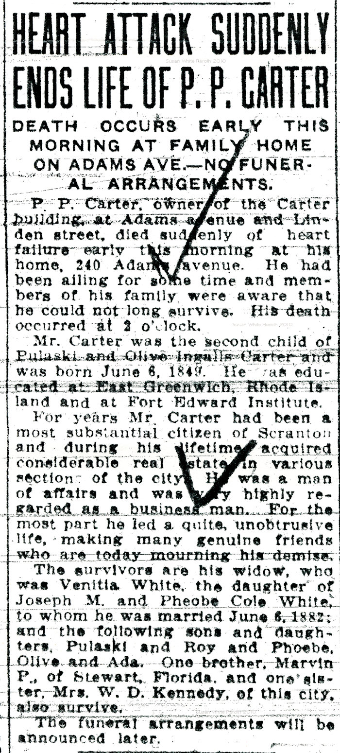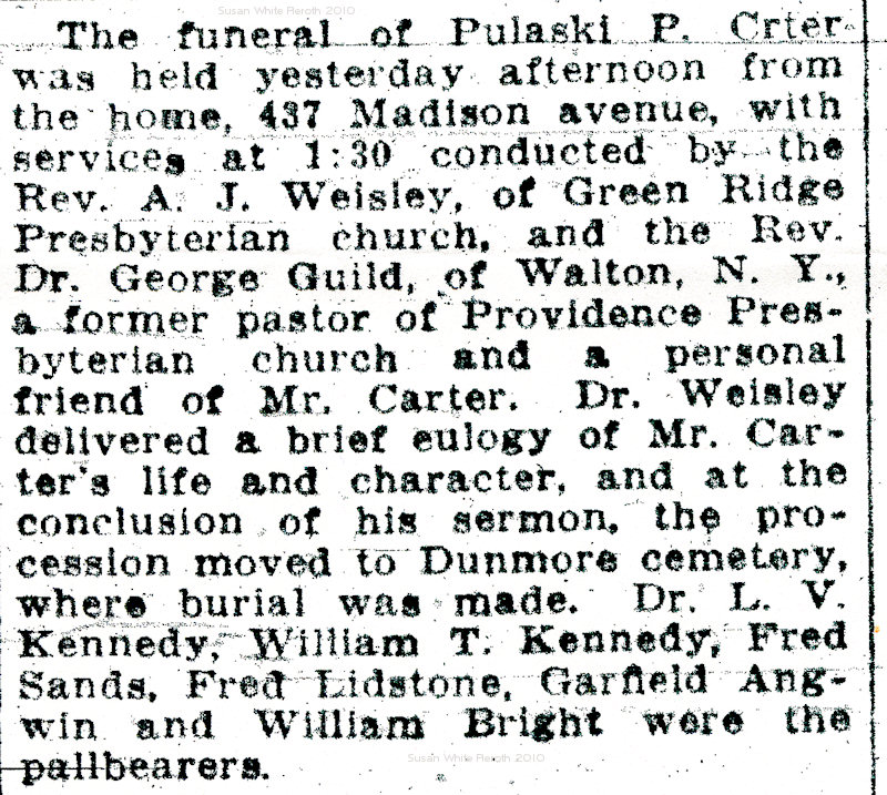 Note: From the Scranton Weekly Republican, October 15, 1884. Pulaski Carter probate record (PDF scan).