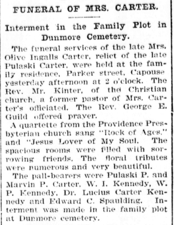 Another of the early residents of Scranton has passed away. Mrs. Olive Ingalls Carter, widow of the late Pulaski Carter, of the Capouse Works, died at the family residence at 8:30 o’clock Thursday evening. She was born in Cantabury [sic], Windham county, Conn., November 18, 1819. She was the daughter of Marvin and Amelia Spaulding Ingalls, both of Puritan ancestry. She was married to Pulaski Carter August 3, 1843. Her entire married life was spent in this city. She has been an invalid for nearly thirty years, so that her quiet life of patient suffering has been known to few outside her intimate friends. She was a woman of unusual strength of character and intellect. During the earlier years of her residence here, she was well known and greatly beloved by those in the vicinity in which she lived, for her many acts of kindness and sympathy to the needy and distressed. She was from early girlhood a member of the Christian church, being a charter member of the church of that denomination in North Scranton. She is survived by her three children, Pulaski P. and Marvin P. Carter and Mrs. W. D. Kennedy, of Green Ridge. A brother and sister also survive her, Walter A. Ingalls, of Norwich, Conn., and Mrs. William Moore, of this city. The funeral services will take place at 2 o’clock Monday afternoon.