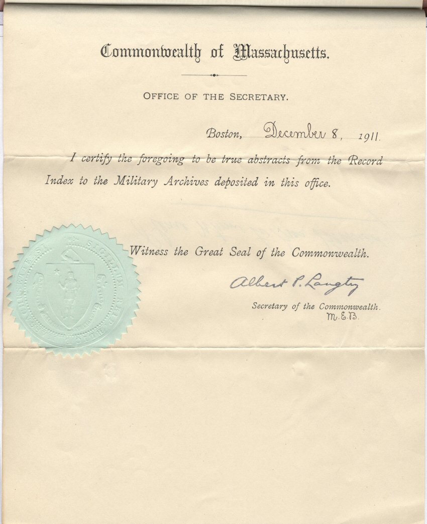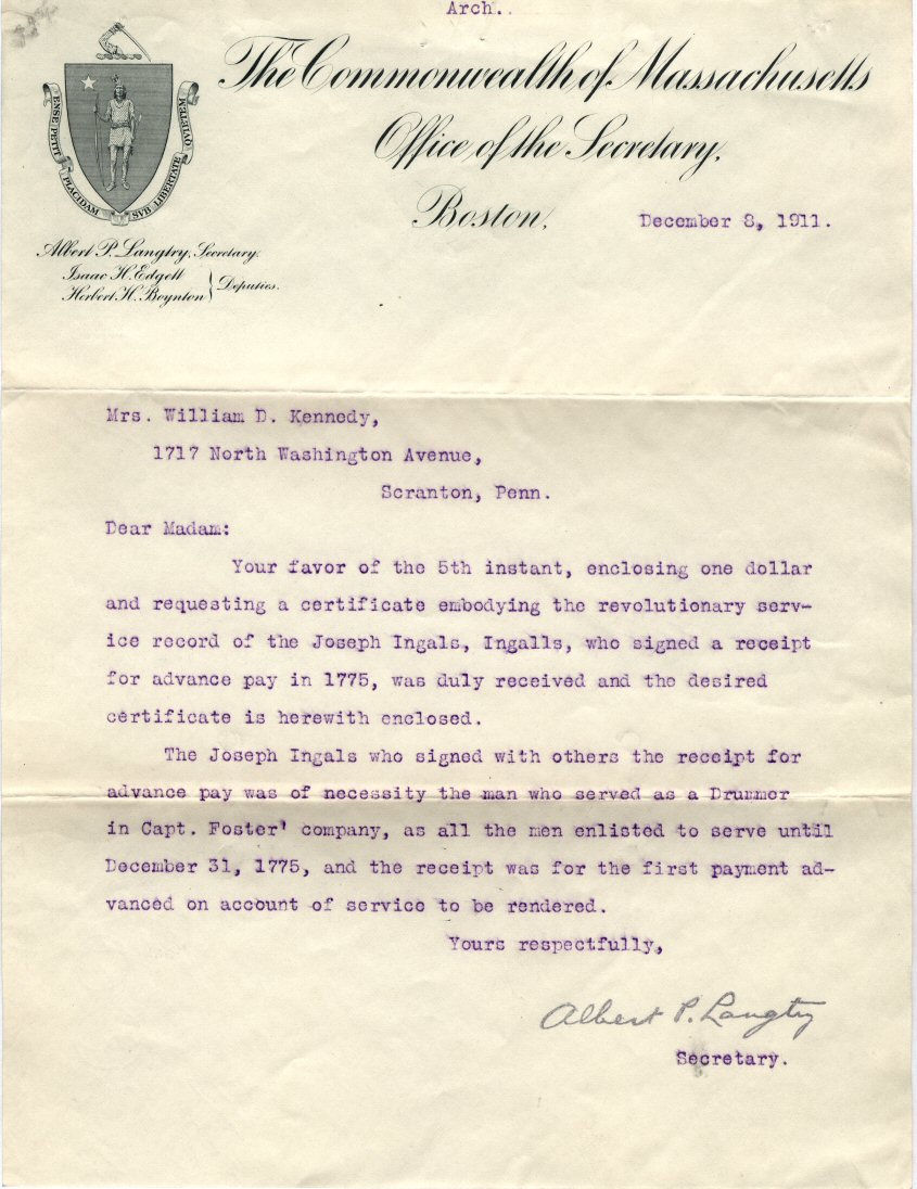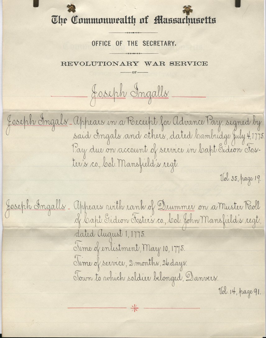 verification of Revolutionary service of Joseph Ingals (Ingalls).