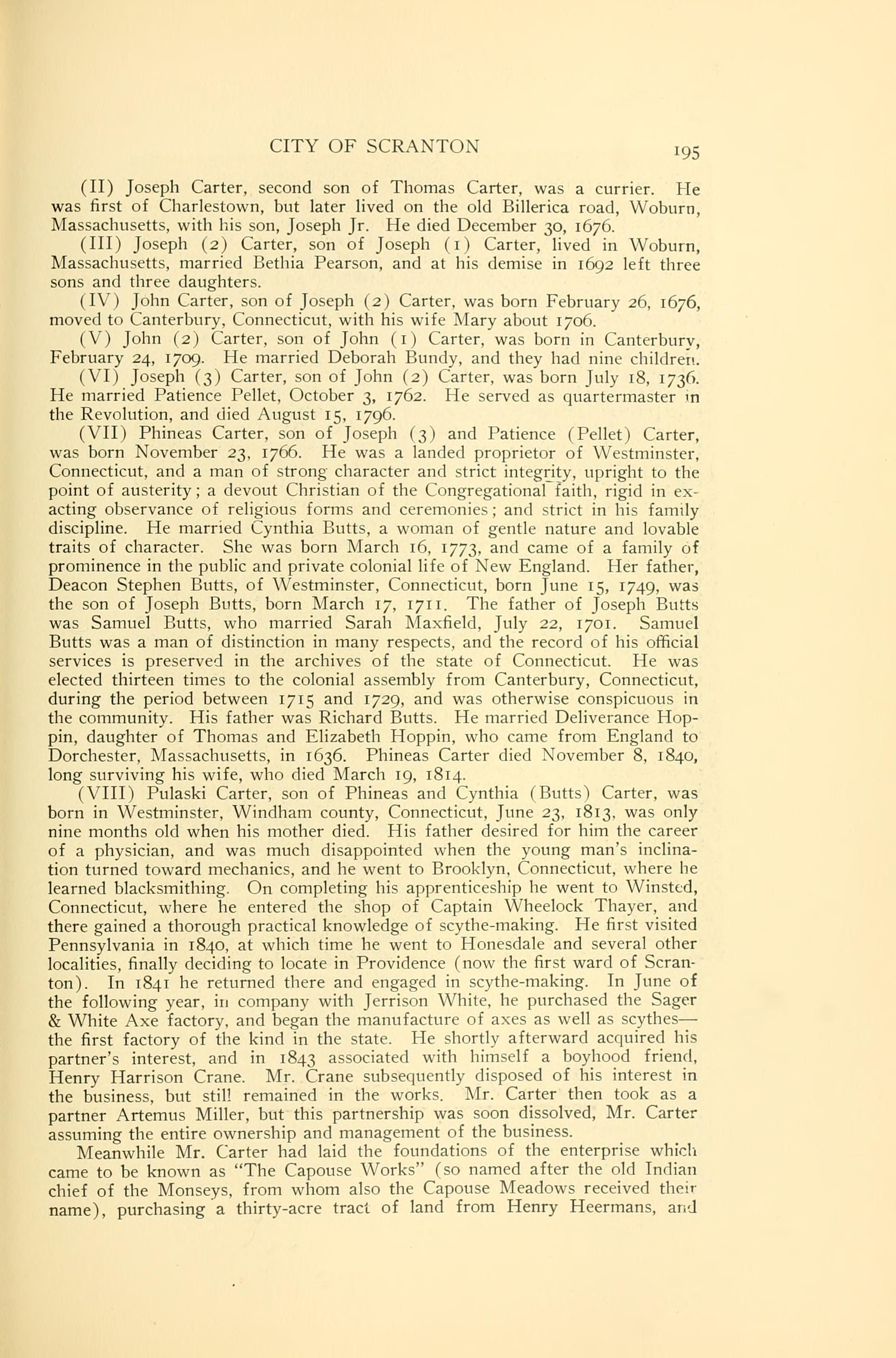 Pulaski Carter, son of Phineas and Cynthia (Butts) Carter, born in Westminster, Windham County, Connecticut, June 23, 1813, was only nine months old when his mother died. His father desired for him the career of a physician, and was much disappointed when the young man's inclination turned toward mechanics, and he went to Brooklyn, Connecticut, where he learned blacksmithing. On completing his apprenticeship he went to Winsted, Connecticut, where he entered the shop of Captain Wheelock Thayer, and there gained a thorough practical knowledge of scythe-making. He first visited Pennsylvania in 1840, at which time he went to Honesdale and several other localities, finally deciding to locate in Providence (now the first ward of Scranton). In 1841 he returned there and engaged in scythe-making. In June of the following year, in company with Jerrison White, he purchased the Sager & White Axe factory, and began the manufacturer of axes as well as scythes—the first factory of the kind in the state. He shortly afterward acquired his partner's interest, and in 1843 associated with himself a boyhood friend, Henry Harrison Crane. Mr. Crane subsequently disposed of his interest in the business, but still remained in the works. Mr. Carter then took as partner Artemus Miller, but this partnership was soon dissolved, Mr. Carter assuming the entire ownership and management of the business.