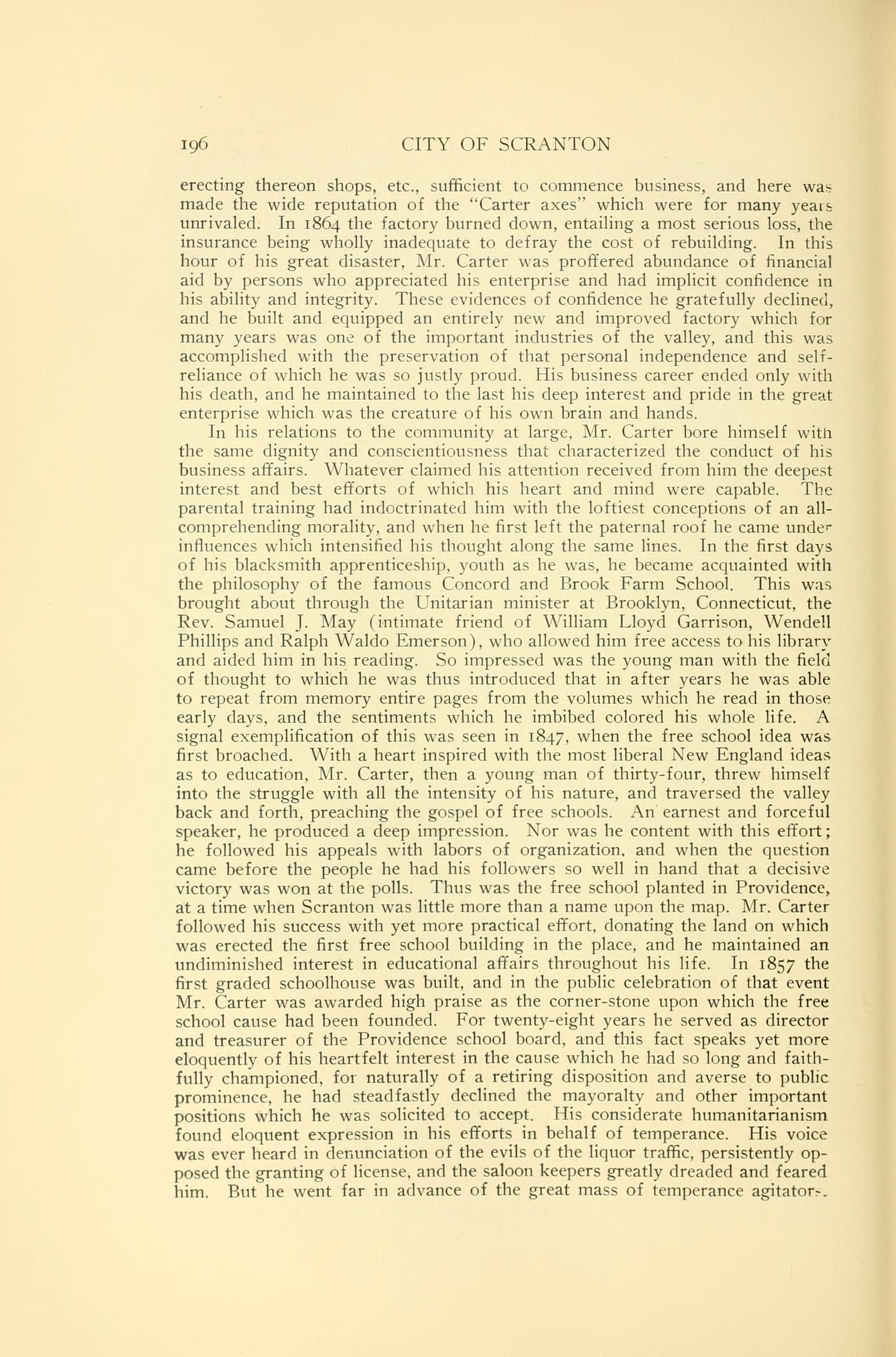 In his relations to the community at large, Mr. Carter bore himself with the same dignity and conscientiousness that characterized the conduct of his business affairs. Whatever claimed his attention received from him the deepest interest and best efforts of which his heart and mind were capable. The parental training had indoctrinated him with the loftiest conceptions of an all-comprehending morality, and, when he first left the paternal roof, he came under influences which intensified his thought along the same lines. In the first days of his blacksmith apprenticeship, youth as he was, he became acquainted with the philosophy of the famous Concord and Brook Farm School. This was brought about through the Unitarian minister at Brooklyn, Connecticut, the Rev. Samuel J. May (intimate friend of William Lloyd Garrison, Wendell Phillips and Ralph Waldo Emerson), who allowed him free access to his library and aided him in his reading. So impressed was the young man wit the field of thought to which he was thus introduced, that in after years he was able to repeat from memory entire pages from the volumes which he read in those early days, and the sentiments which he imbibed colored his whole life. A signal exemplification of this was seen in 1846, when the free school idea was first broached. With a heart inspired with the most liberal New England ideas as to education, Mr. Carter, then a young man of thirty-four, threw himself into the struggle with all the intensity of his nature, and traversed the valley back and forth, preaching the gospel of free schools. An earnest and forceful speaker, he produced a deep impression. Nor was he content with this effort; he followed his appeals with labors of organization, and, when the question came before the people, had his followers so well in hand that a decisive victory was won at the polls. Thus was the free school planted in Providence, at a time when Scranton was little more than a name upon the map. Mr. Carter followed his success with yet more practical effort, donating the land on which was erected the first free school building in the place, and he maintained an undiminished interest in educational affairs throughout his life. In 1857 the first graded schoolhouse was built, and in the public celebration of that event Mr. Carter was awarded high praise as the corner-stone upon which the free school cause had been founded. For twenty-eight years he served as director and treasurer of the Providence school board, and this fact speaks yet more eloquently of his heartfelt interest in the cause which he had so long and faithfully championed, for, naturally of a retiring disposition, and averse to public prominence, he had steadfastly declined the mayoralty and other important positions which he was solicited to accept. His considerate humanitarianism found eloquent expression in his efforts in behalf of temperance. His voice was ever heard in denunciation of the evils of the liquor traffic, persistently opposed to granting of licenses, and the saloon keepers greatly dreaded and feared him. But he went far in advance of the great mass of temperance agitators. He gave his personal effort to the reclamation of the drunkard, and rescued many a one from a life of poverty and shame, and aided him to an honest and happy establishment in life.