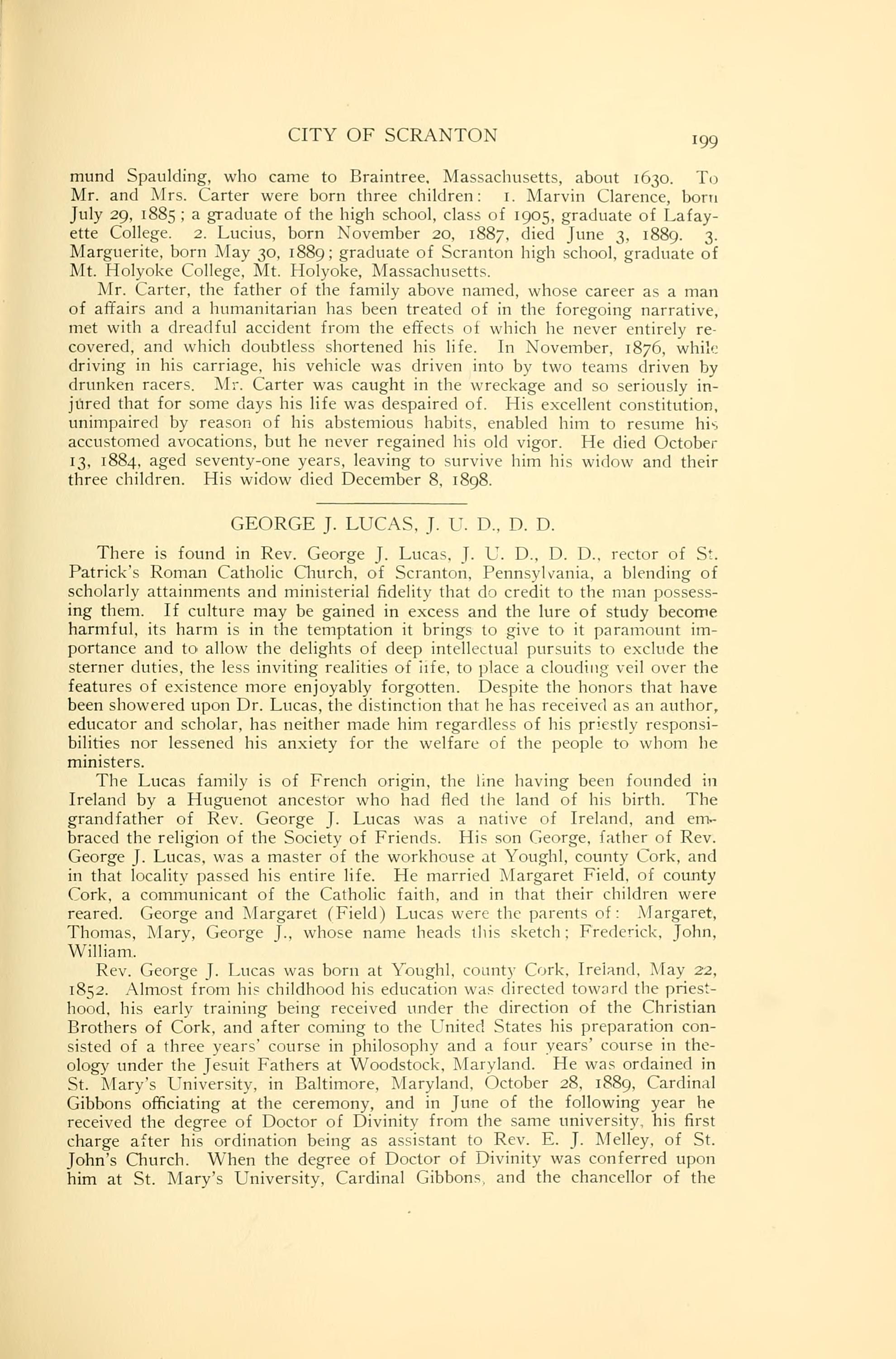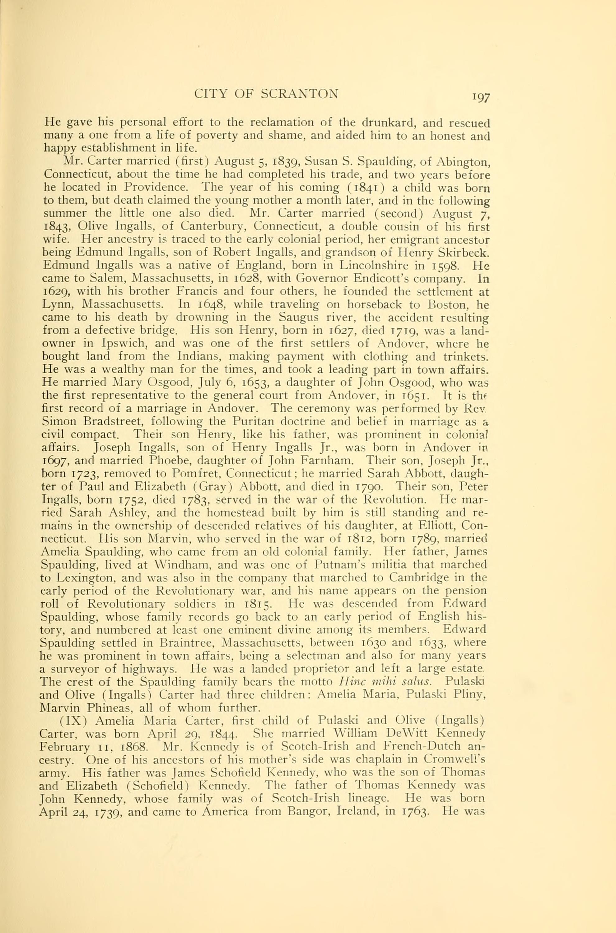 Marvin Phineas, youngest child of Pulaski and Olive (Ingalls) Carter, was born November 28, 1857. He was graduated at East Greenwich, Rhode Island. He is one of the successful business men in Scranton, the owner of valuable real estate, a director in the People's Bank, and otherwise actively identified with the business of the city. He married Minnie Parmelia Murphy, born June 26, 1863, daughter of John {Archbald} Murphy, of Warrenville, Connecticut. He was several times elected to the state legislature, and is a man of business prominence in the town where he resides. Her mother was Mary, daughter of Benjamin Spaulding, descended from Edmund, who came to Braintree, Massachusetts, about 1630. To them were born three children: 1. Marvin Clarence, born July 29, 1885, a graduate of the high school, class of 1905, freshman in Lafayette College {graduated}. 2. Lucius, born November 20, 1887, died June 3, 1889. 3. Marguerite, born May 30, 1889, a senior in Scranton high school {graduated, graduated of Mr. Holyoke College, Mr. Holyoke, Massachusetts}.