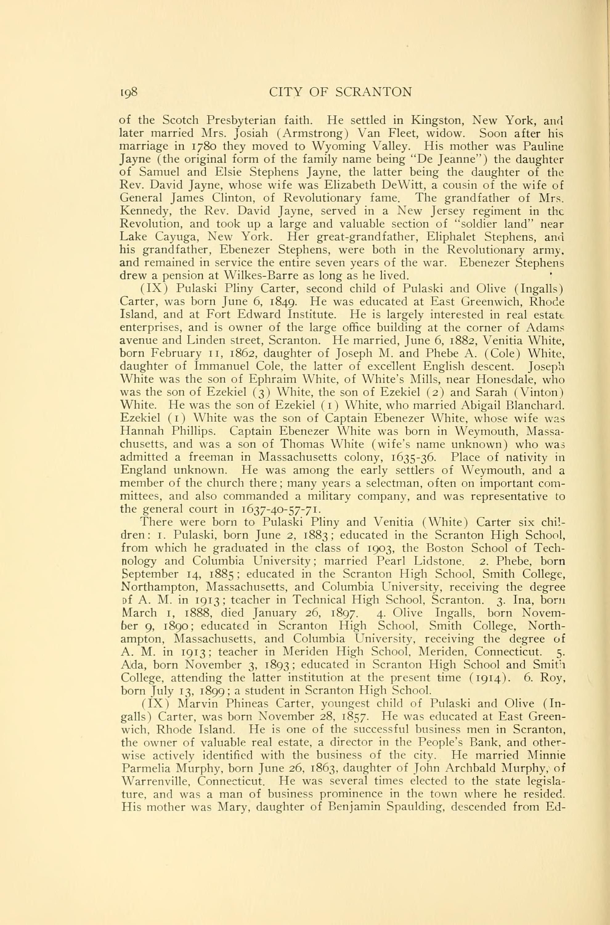 Pulaski Pliny, second child of Pulaski and Olive (Ingalls) Carter, was born June 6, 1849. He was educated at East Greenwich, Rhode Island, and at Fort Edward Institute. He is largely interested in real estate enterprises, and is owner of the large office building at the corner of Adams avenue and Linden street, Scranton. He married, June 6, 1882, Venitia White, born February 11, 1862, daughter of Joseph M. and Phebe A. (Cole) White, daughter of Immanual Cole, the latter of excellent English descent. Joseph White was the son of Ephraim White, of White's Mills, near Honesdale, who was the son of Ezekiel White (Third) the son of Ezekiel White, Jr., and Sarah Vinton White. He was the son of Ezekiel White (1st) who married Abigail Blanchard. Ezekiel (1st) was the son of Captain Ebenezer White, whose wife was Hannah Phillips. Captain Ebenezer was born in Weymouth, Massachusetts, and was a son of Thomas White (wife's name unknown) who was admitted a freeman in Massachusetts colony 1635-6. Place of nativity in England unknown. He was among the early settlers of Weymouth, and a member of the church there; many years a selectman, often on important committees, and also commanded a military company, and was representative to the general court in 1637, 1640, 1657 and 1671.