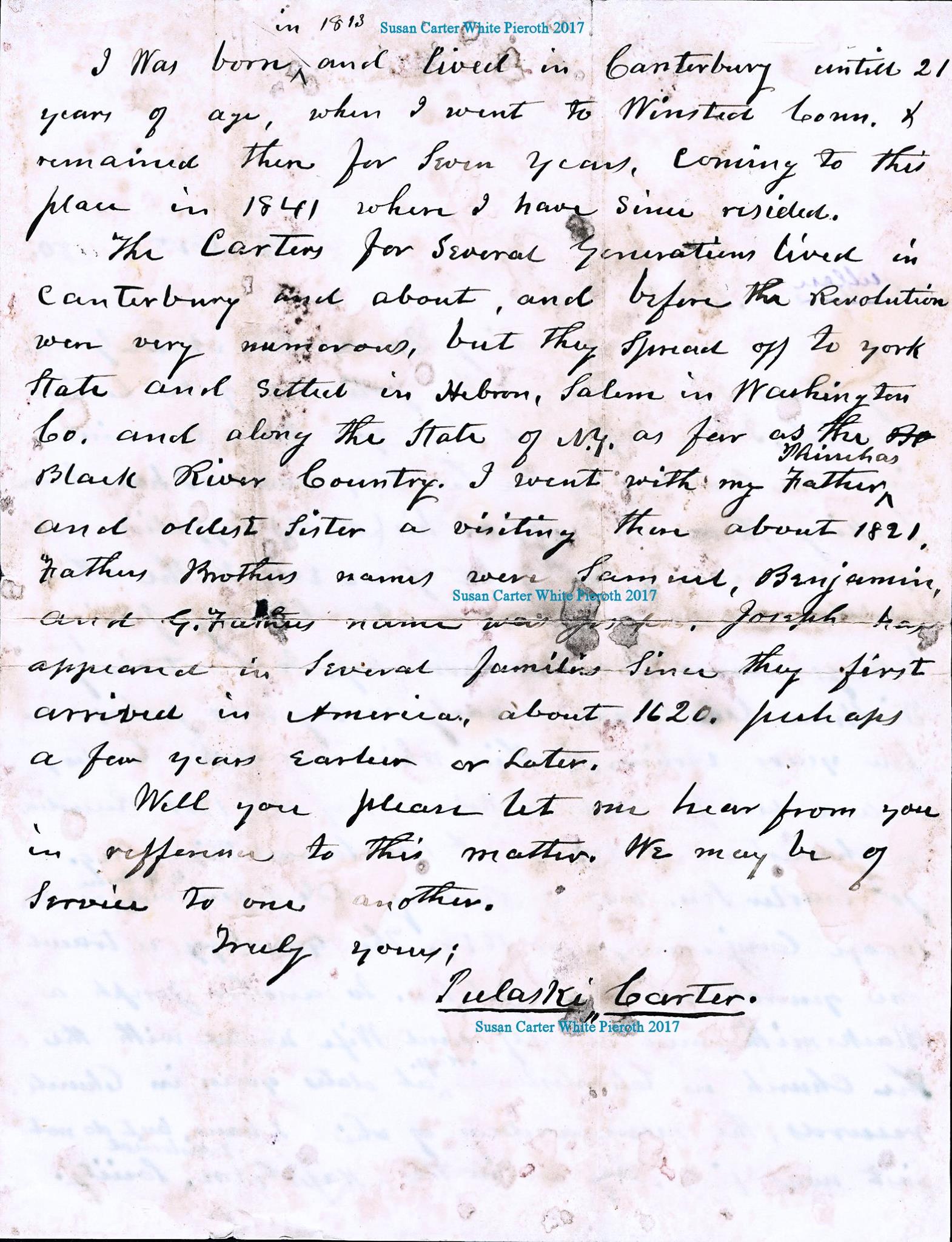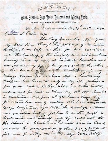 PULASKI CARTER, deceased, was one of the strongest characters and most useful men of his day. He inherited in marked degree the sterling straits of his New England ancestry, and his name was ever a synonym for the strictest integrity and most uncompromising devotion to principle. His family has been from the beginning of its history in America, notable for patriotism and public spirit of the highest quality.