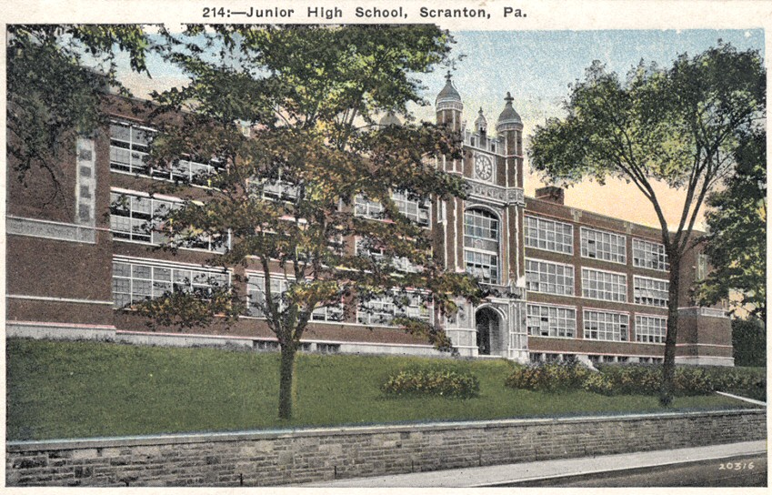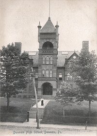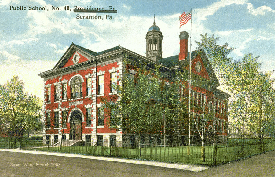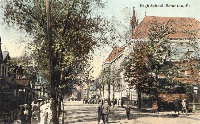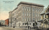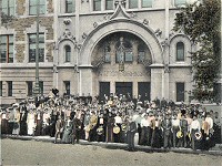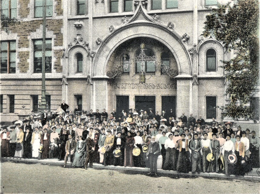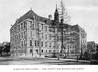 by fire in 1908. Below: Fire Drill at the new building that has some