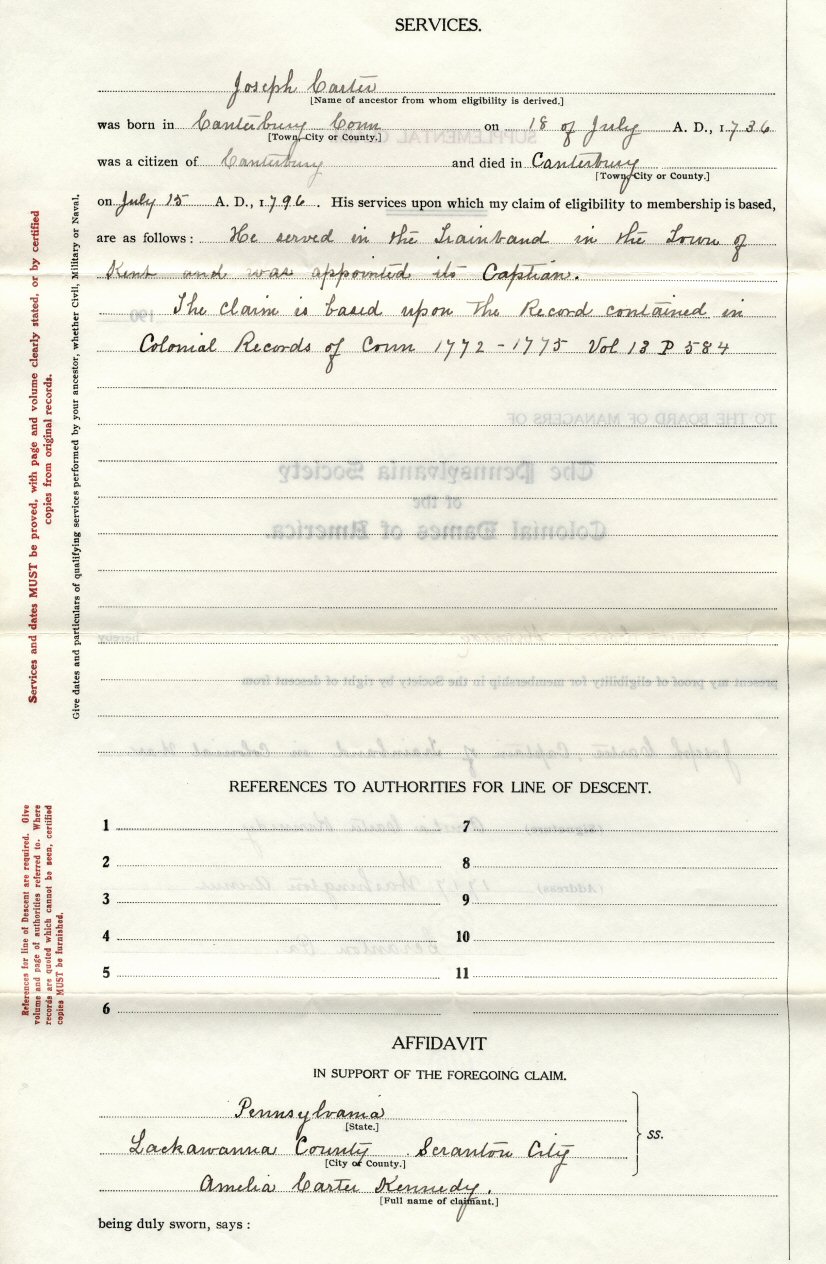 Joseph Carter, of Canterbury, Connecticut, is first. This seems to be a rough draft, but it does contain pertinent names and dates. This is the same ancestor as was used in the first DAR application.