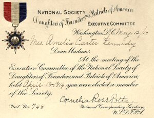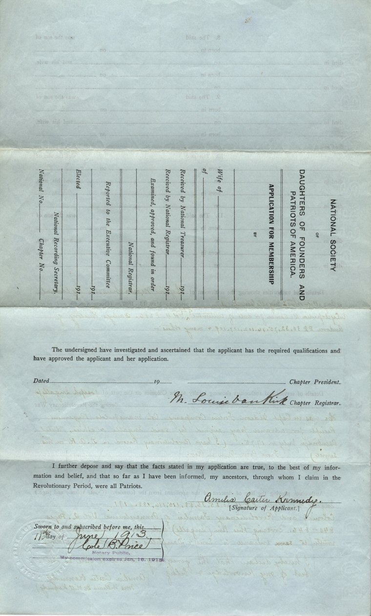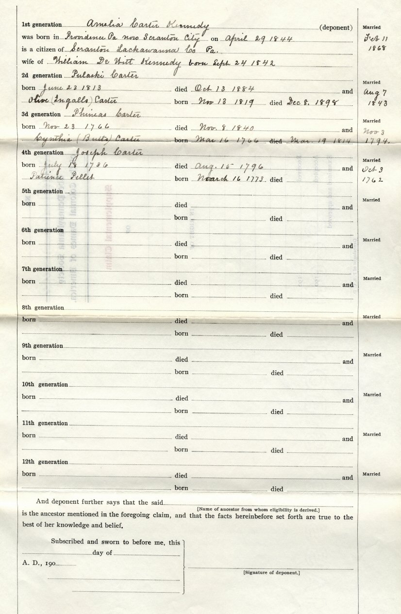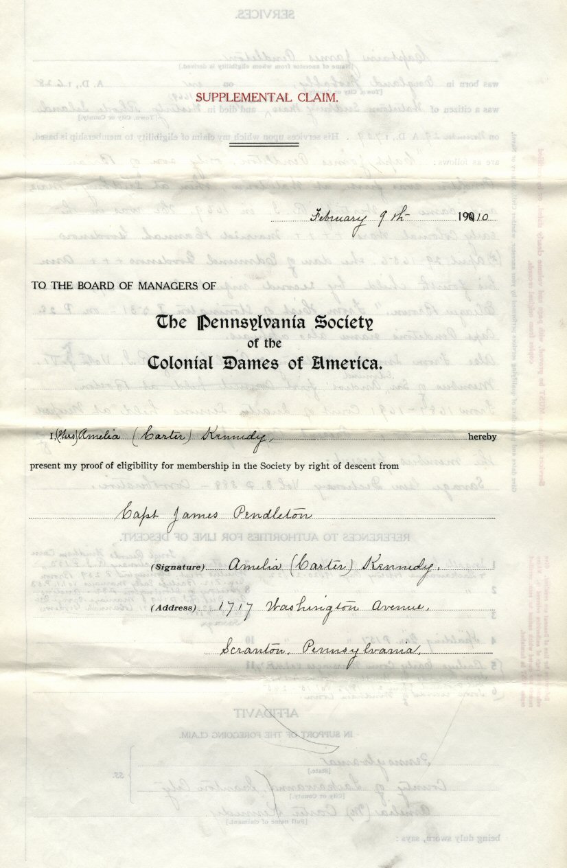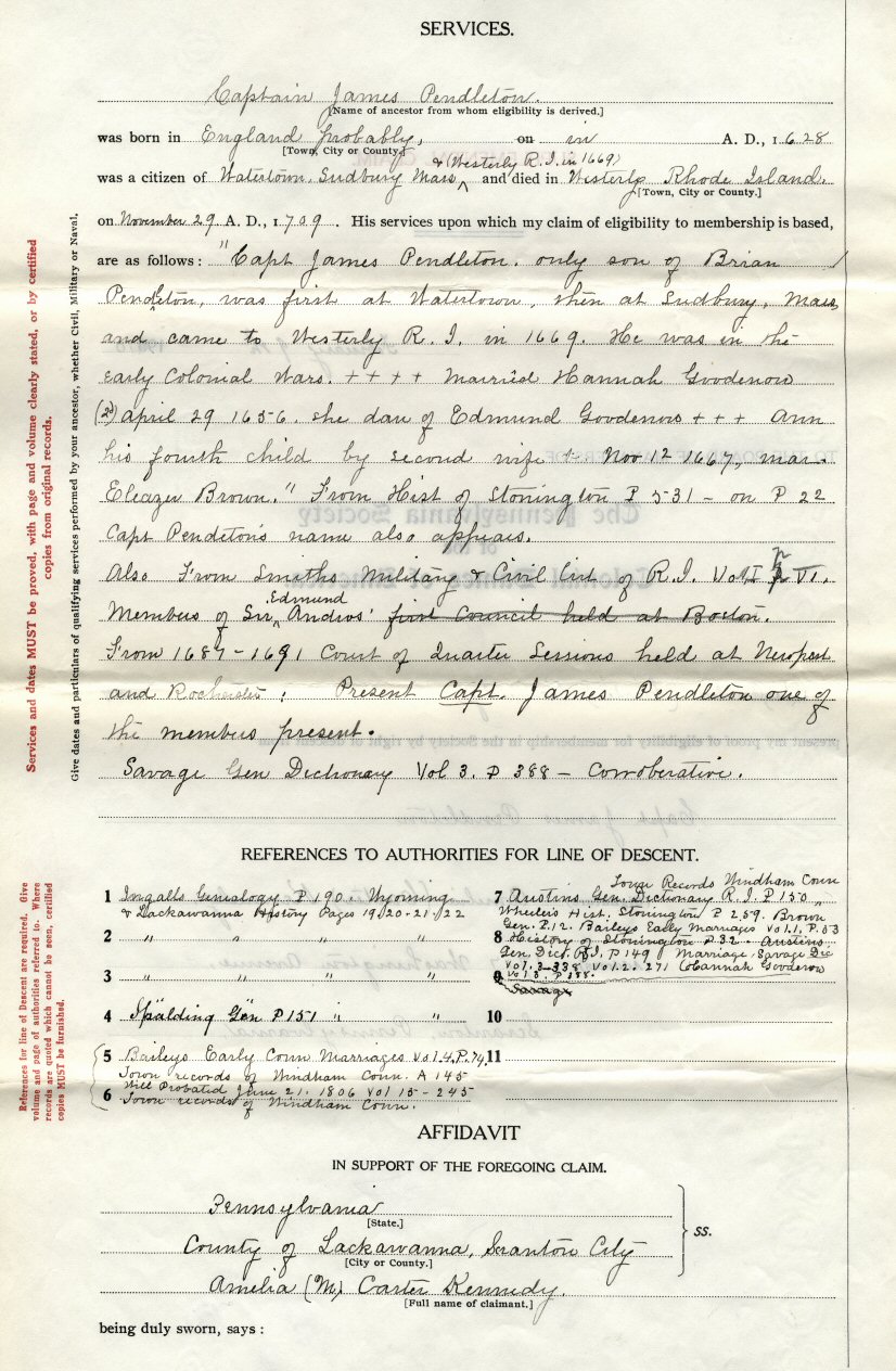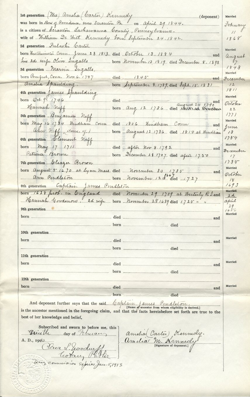 James Pendleton, probably born in England, was a citizen of Watertown, Massachusetts, and died in Westerly, Rhode Island. The line is through her mother, Olive Ingalls Carter. This application is completed, signed, and notarized in 1910.