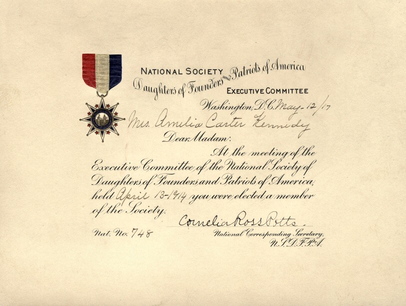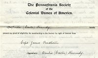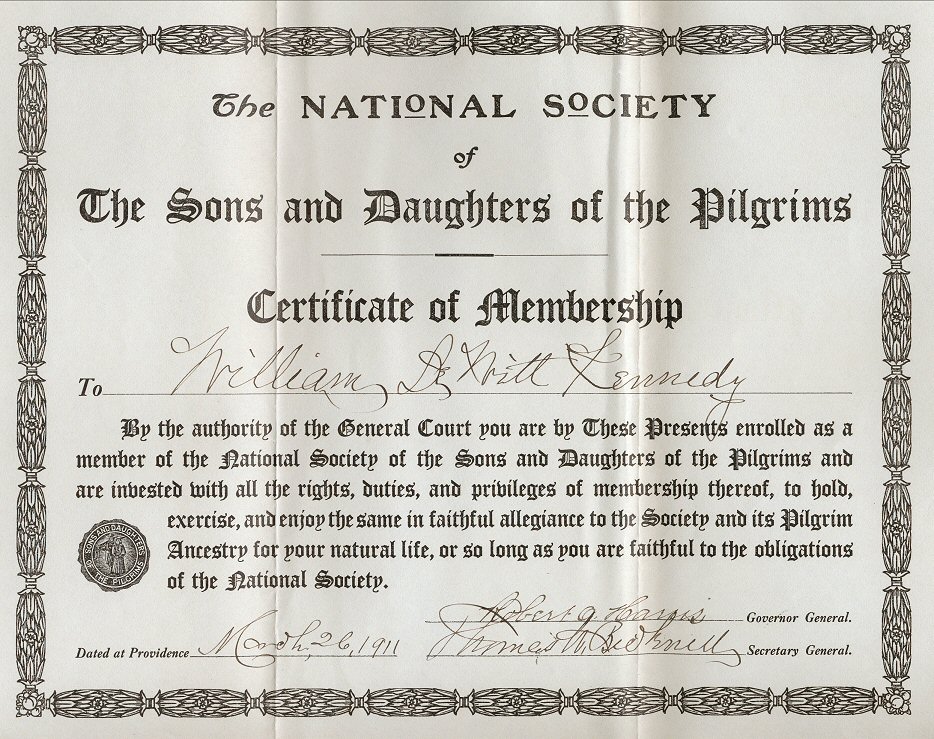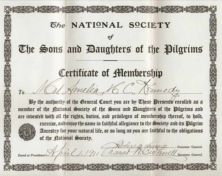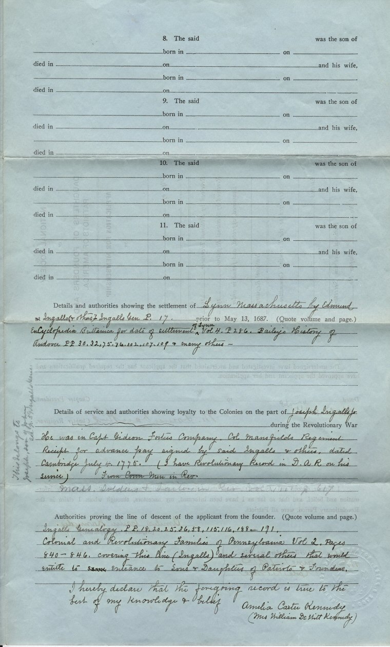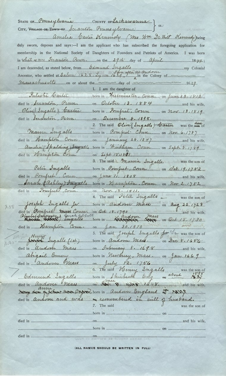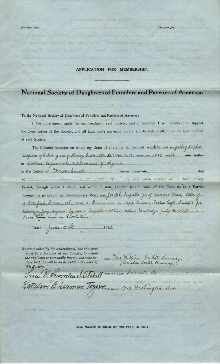 | The 1913 application for membership is similar to that for the DAR and others. She used Edmund Ingalls (first of Lynn and later Andover, Massachusetts). All four sides of the approved and notarized copy have been scanned. Page 1, page 2, page 3, page 4 (the images are large). |