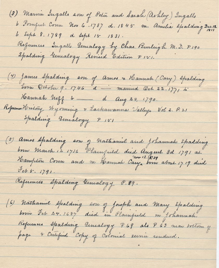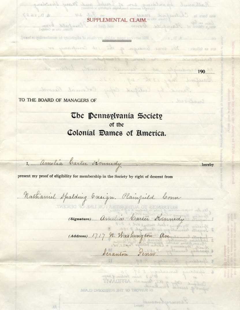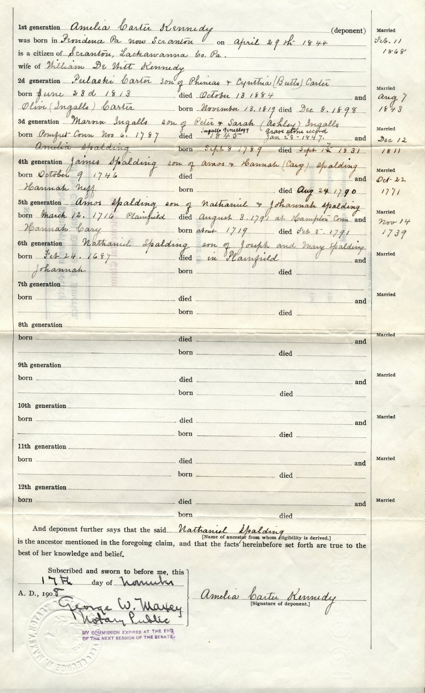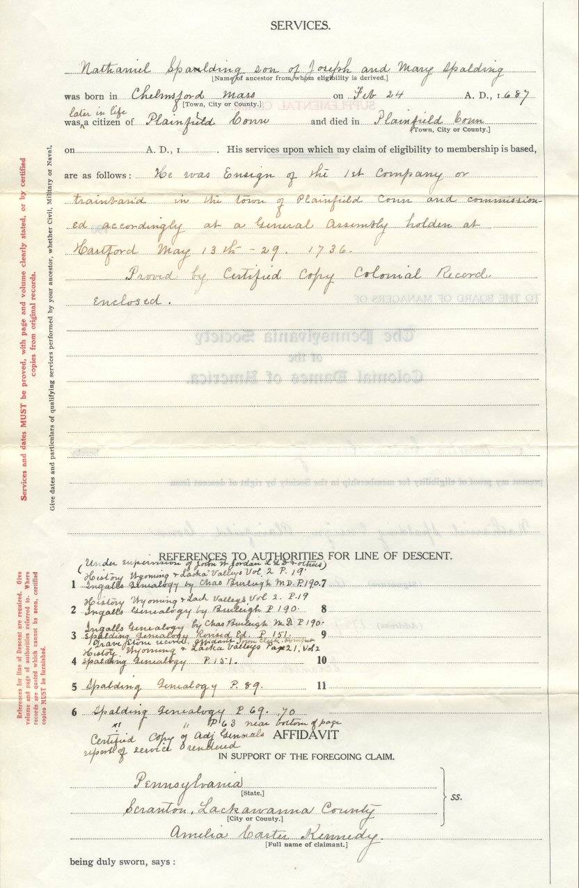 Nathaniel Spalding (Spaulding) of Chelmsford, Massachusetts, and Plainfield, Connecticut, is also an ancestor to Amelia through her mother. This application was completed and notarized in 1908. Accompanying this claim are two pages of information. They have been scanned (page 1 and page 2) for the extensive reference list.
