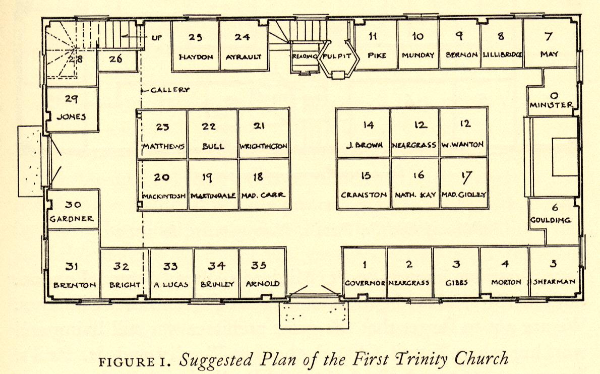 "In Figure I is a conjectural restoration of the plan of the original Trinity Church. This drawing assumes a resemblance to the St. Paul's Narragansett and to King's Chapel, both of which have a curious likeness to St. Mildred's, Bread Street, London, built in 1681, said to be the least altered of [Sir Christopher] Wren's City Churches."