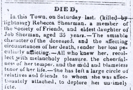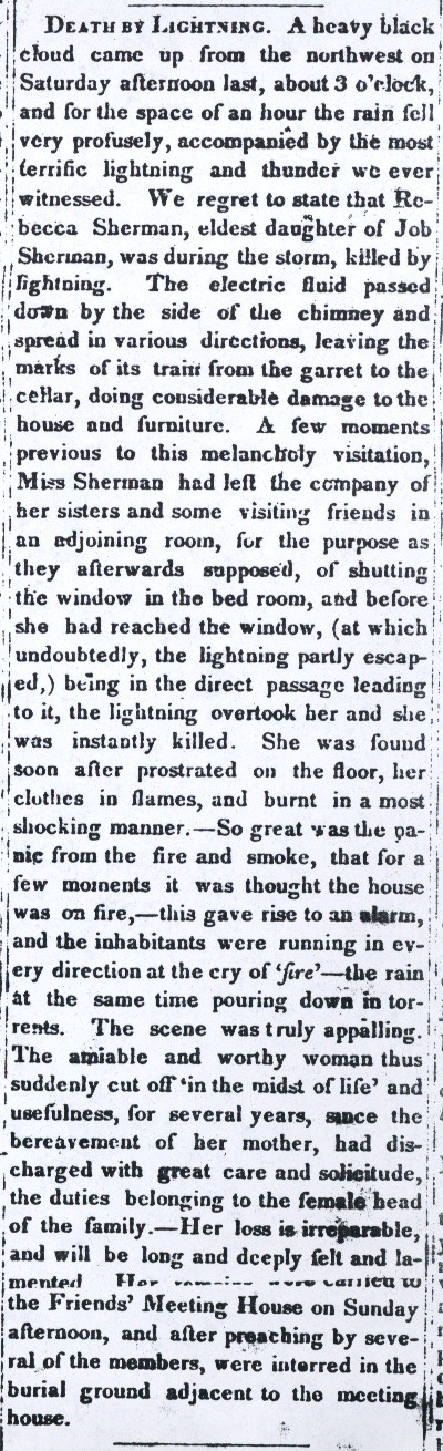 DEATH BY LIGHTNING. A heavy black cloud came up from the northwest on Saturday afternoon last, about 3 o'clock, and for the space of an hour the rain fell very profusely, accompanied by the most terrific lightning and thunder we ever witnessed. W regret to state that Rebecca Sherman, eldest daughter of Job Sherman, was during the storm, killed by lightning. The electric fluid passed down by the side of the chimney and spread in various directions, leaving he marks of its train from the garret to the cellar, doing considerable damage to the hose and furniture. A few moments previous to this melancholy visitation, Miss Sherman had left the company of her sisters and some visiting friends in an adjoining room, for the purpose as they afterwards supposed, of shutting the window in the bed room, and before she had reached the window. (at which undoubtedly, the lightning partly escaped,) being in the direct passage leading to it, the lightning overtook her and she was instantly killed. She was found soon after prostrated on the floor, her clothes in flames, and burnt in a most shocking manner.-So great was the panic from the fire and smoke, that for a few moments it was thought the house was on fire,--this gave rise to an alarm, and the inhabitants were running in every direction at the cry of 'fire'-the rain at the same time pouring down in torrents. The scene was truly appalling. The amiable and worthy woman thus suddenly cut off 'in the midst of life' and usefulness, for several years, since the bereavement of her mother, had discharged with great care and solicitude, the duties belonging to the female head of the family.-Her loss is irreparable, and will be long deeply felt and lamented. Her remains were carried to the Friends' Meeting House on Sunday afternoon, and after preaching by several of the members, were interred in the burial ground adjacent to the meeting house.