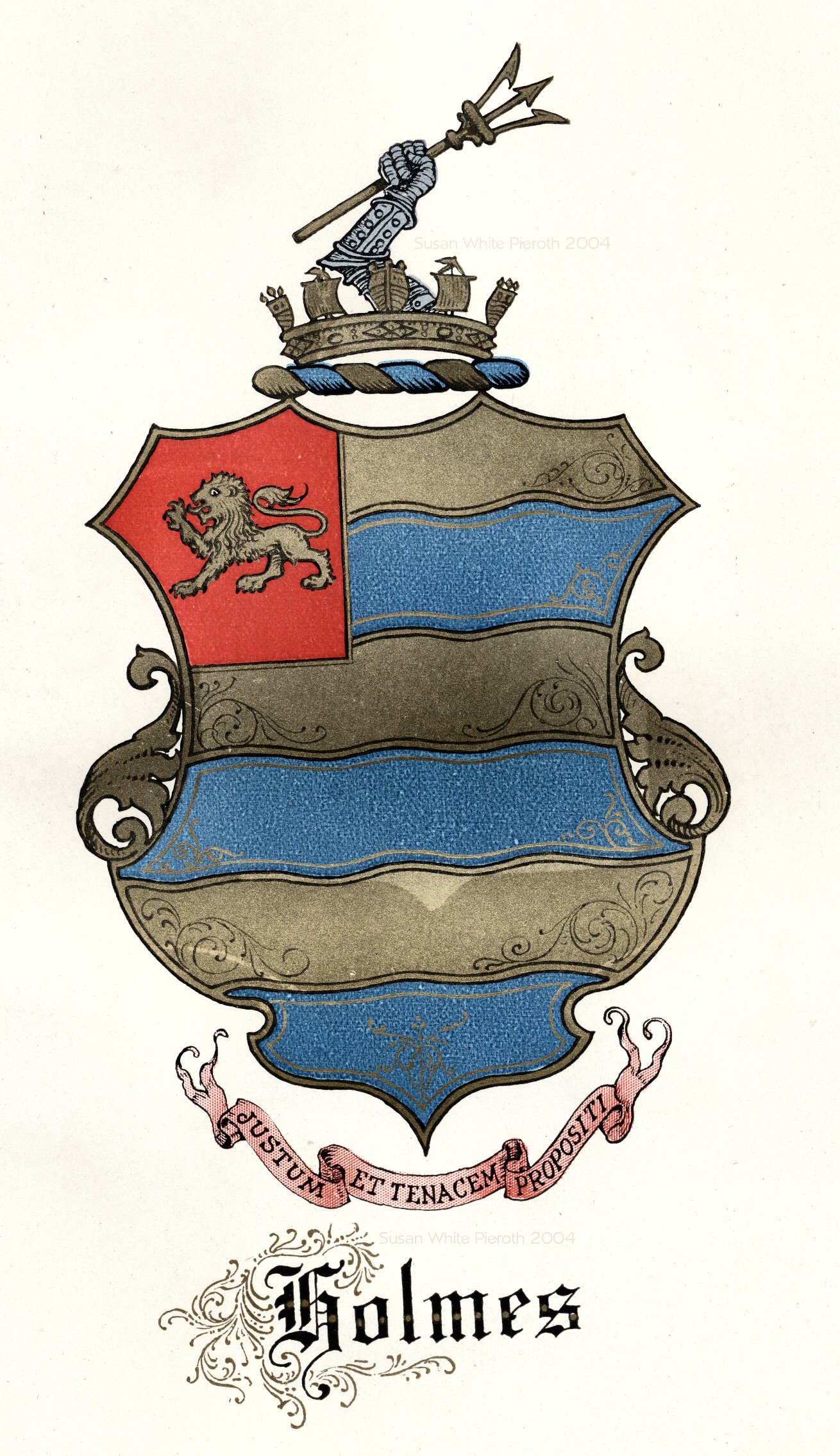 Crest--Out of a naval crown or, a dexter arm embowed in armor, holding a trident proper, spear gold.