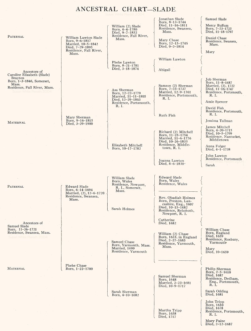 (VII) Caroline Elizabeth Slade, eldest child of William Lawton and Mary (Sherman) Slade, was born January 3, 1846, in Somerset, and became the wife of Hezekiah Anthony Brayton, of Fall River. (See Brayton VII).