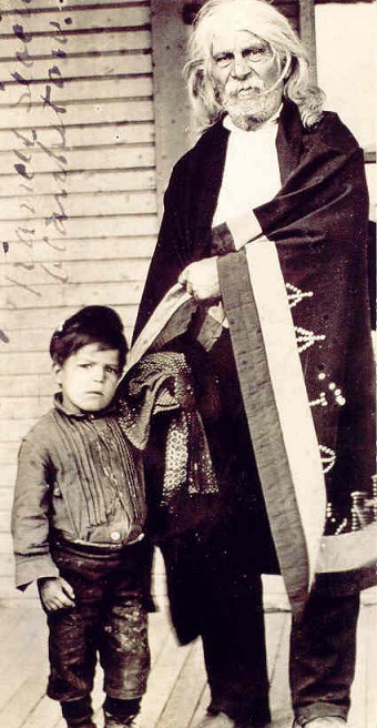 Capt. Jean Baptiste Brouillette - "He wore a fine frock coat of the latest fashion. When the Indian assumes the white man's garb, he always chooses a frock coat. It is an object of beauty to his eye. His 'pesmoker,' or shirt, was white, spotted with small red figures, overhanging very handsome blue leggings, 'winged' with very rich silk ribbons of prismatic hues, exhibiting the squaw's skillful needle work. A handsome red silk sash was thrown gracefully over his left shoulder, and passing over his breast and under the right arm, with clusters of knots, and fringed masses, gave point and style to Brouillette's tall and majestic figure." "Mrs. Phelps also owns a full length painting in oil of Captain Brouillette, husband of Ke-ke-se-qua, painted from a sketch made by Winter in 1837. It represents him clad in a semi-civilized costume of gaudy colors." [Ch. XII, John F. Meginness, "Biography of Frances Slocum, The Lost Sister of Wyoming"] Picture, signed Jennie Brownscombe, from Frances Slocum; The Lost Sister of Wyoming, by Martha Bennett Phelps, 1916. |